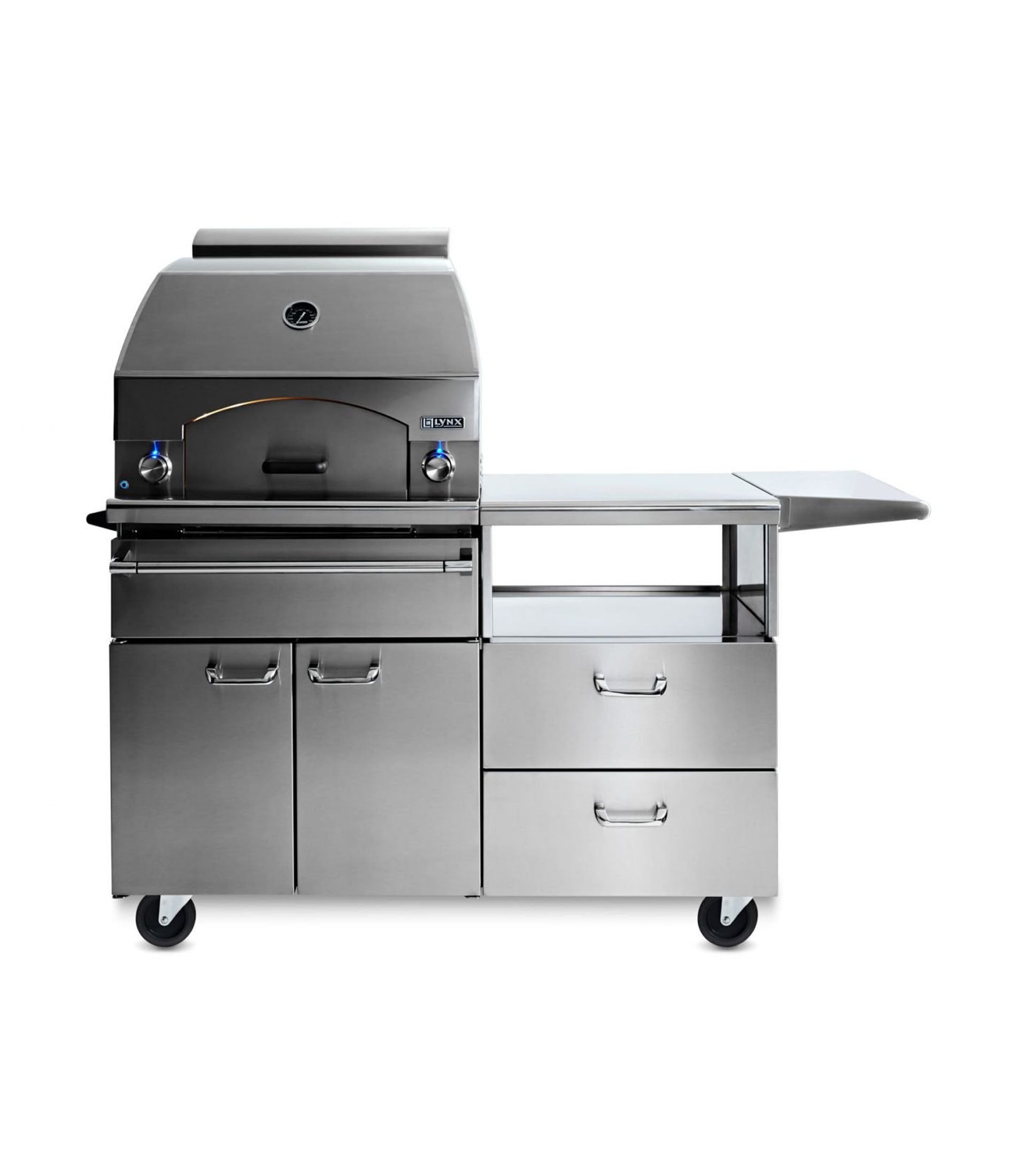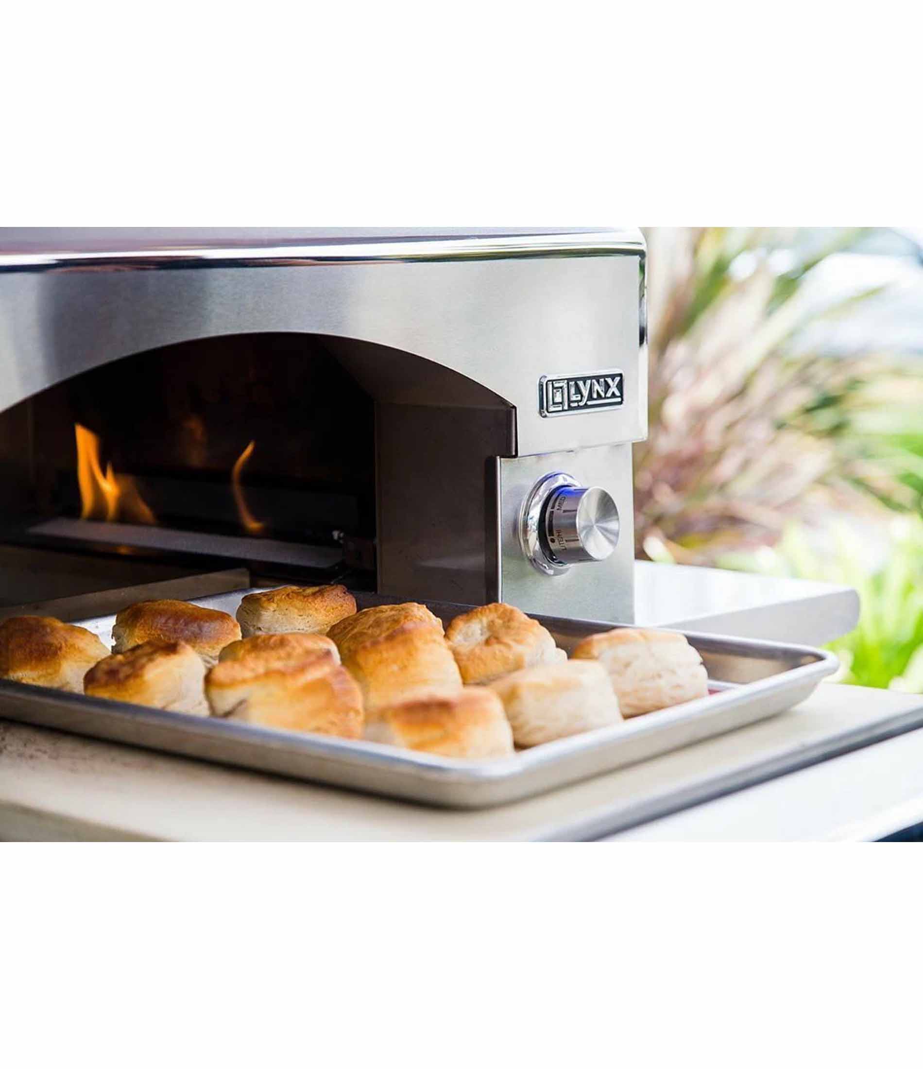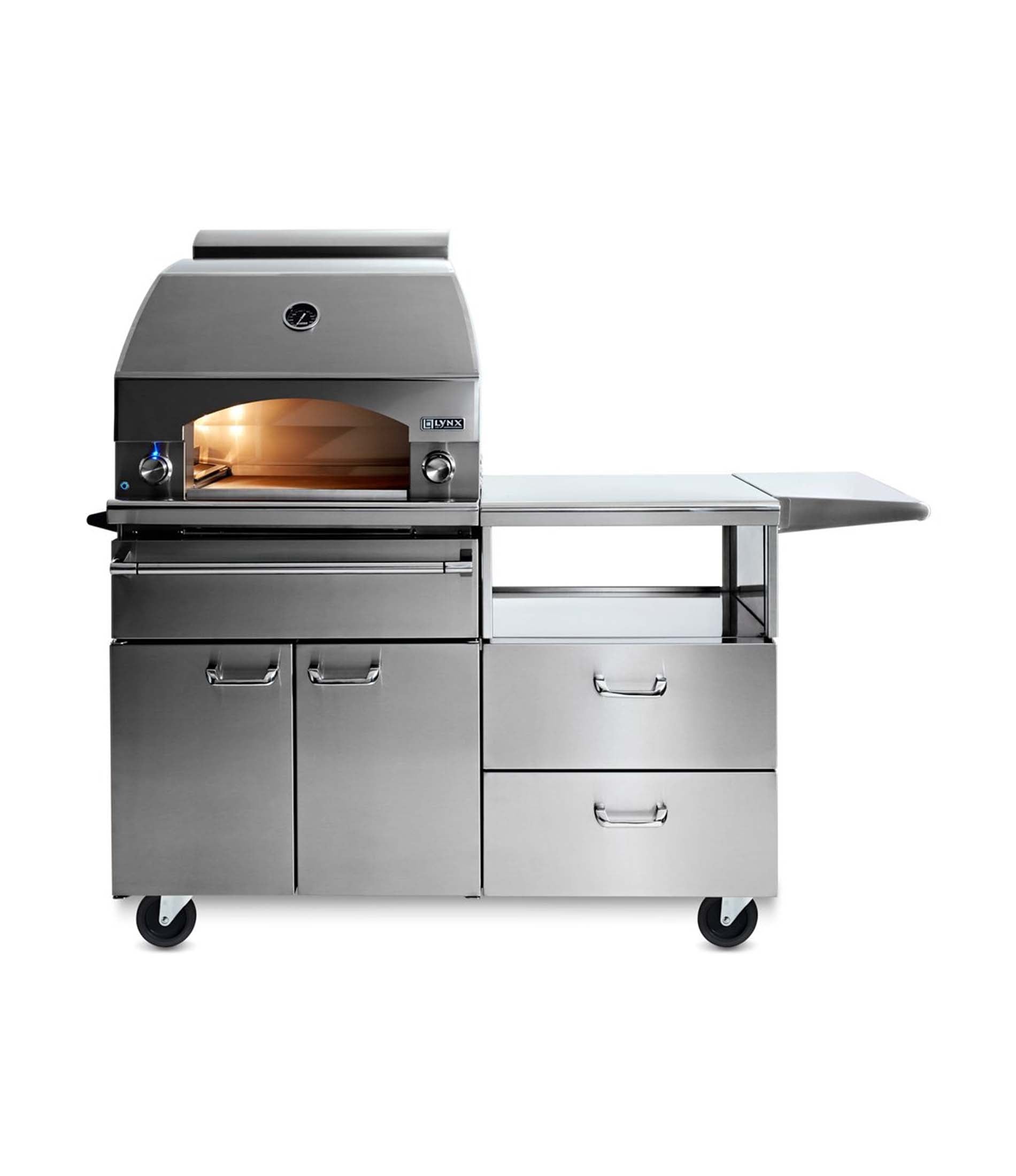 Elevate your outdoor culinary adventures with the Lynx 30" Napoli Outdoor Oven on Mobile Kitchen Cart (LPZAF). This freestanding masterpiece combines professional-grade performance with elegant design, offering the flexibility to craft authentic stone-baked dishes anywhere in your outdoor space. Mounted on a 54" stainless steel mobile cart, it provides ample prep space and storage, making it a versatile addition to any backyard gathering.
