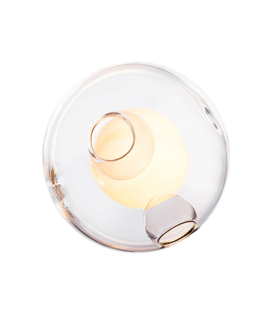 28 results from an innovative fabrication process that manipulates both the temperature and the direction of air flow into blown glass. The result is a slightly distorted sphere with an interior landscape of satellite shapes, including an opaque milk glass diffuser that houses either a low-voltage xenon or LED lamp.
