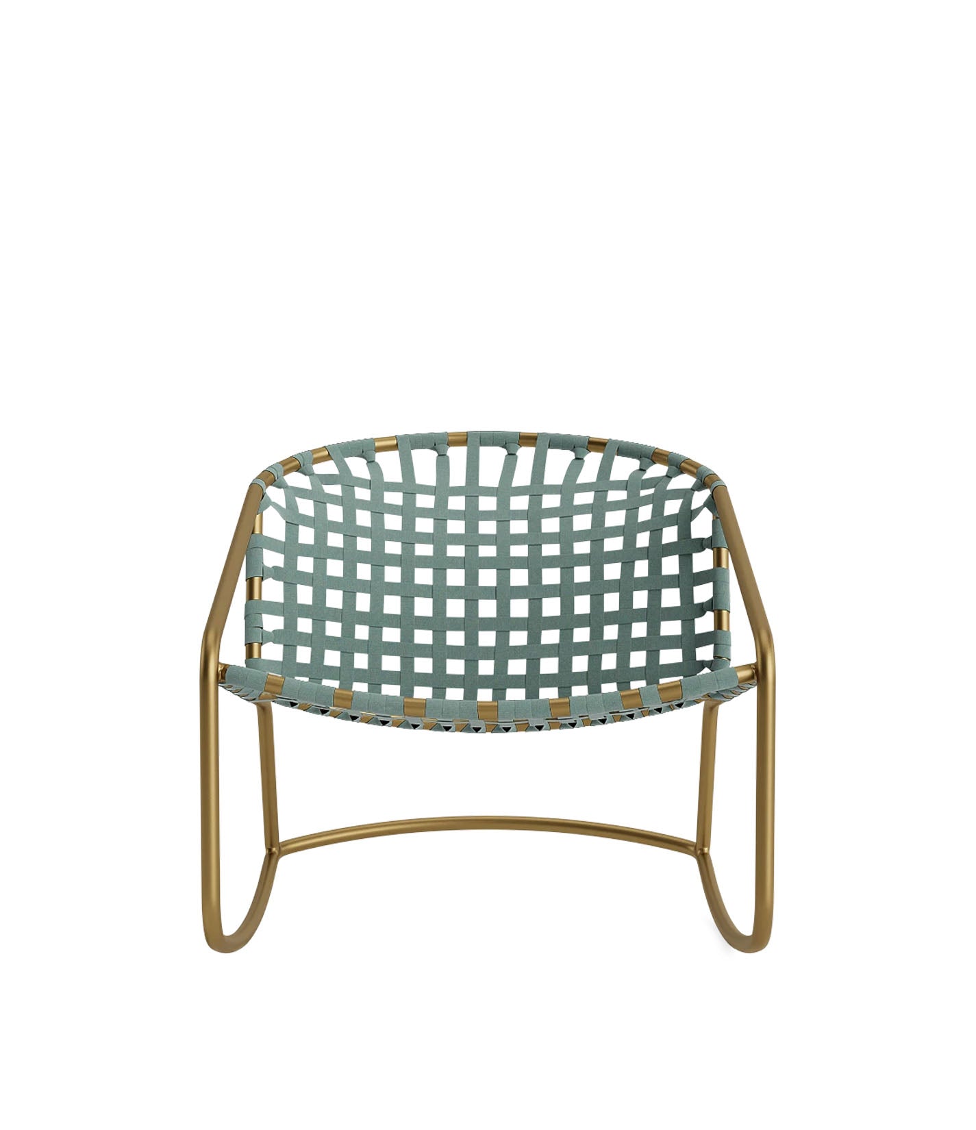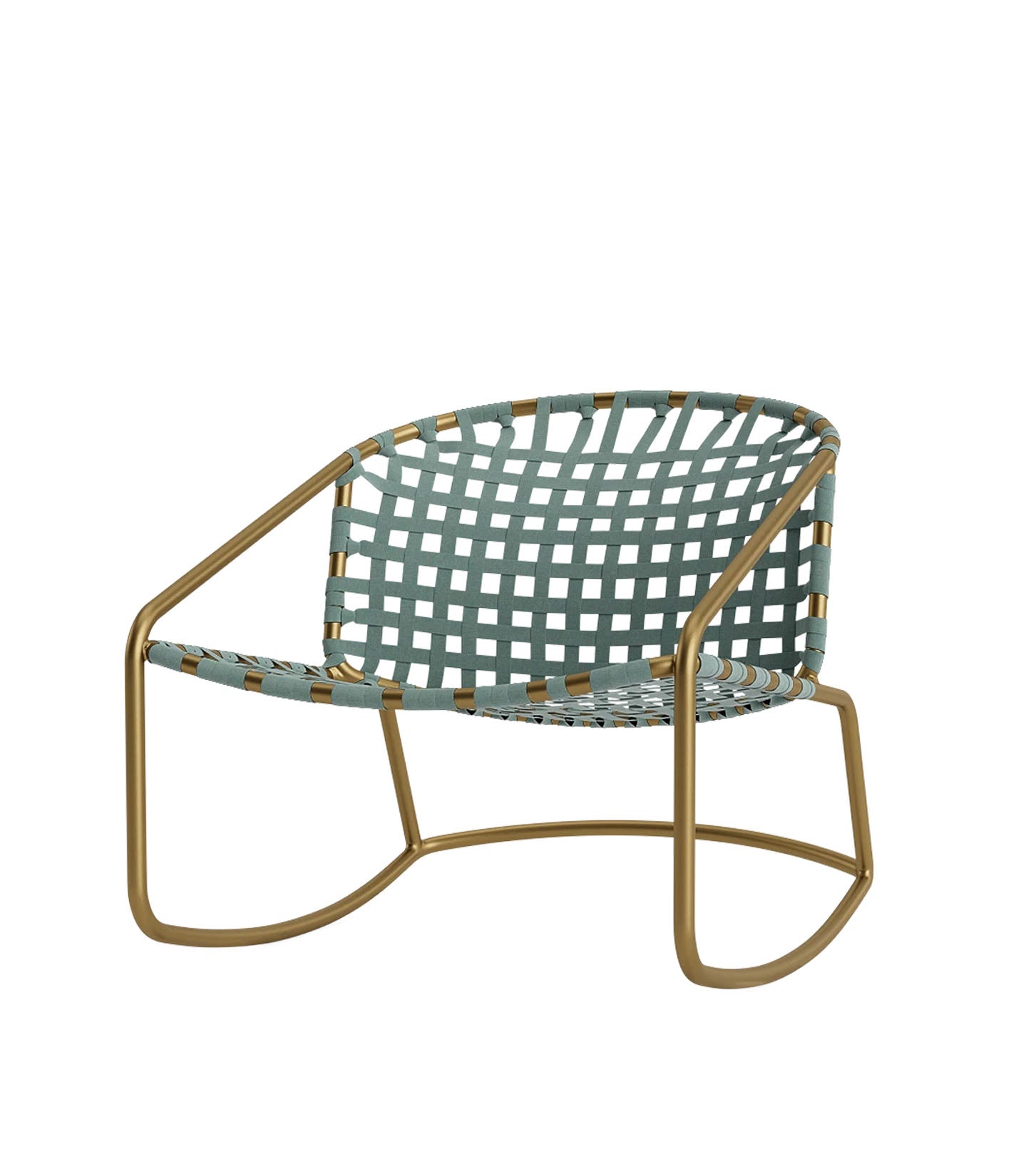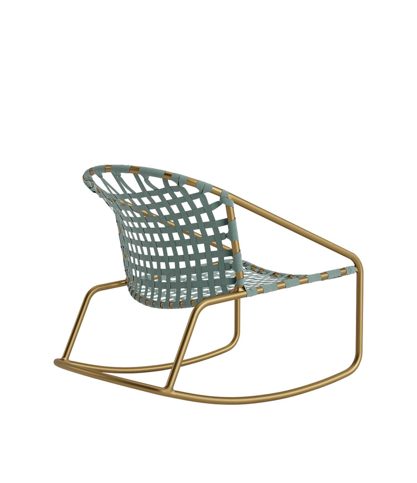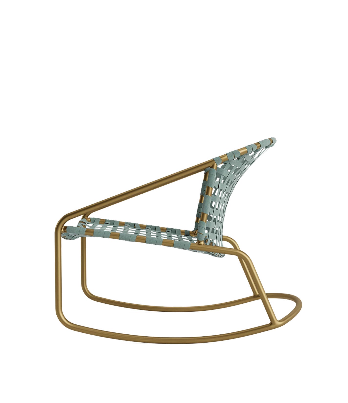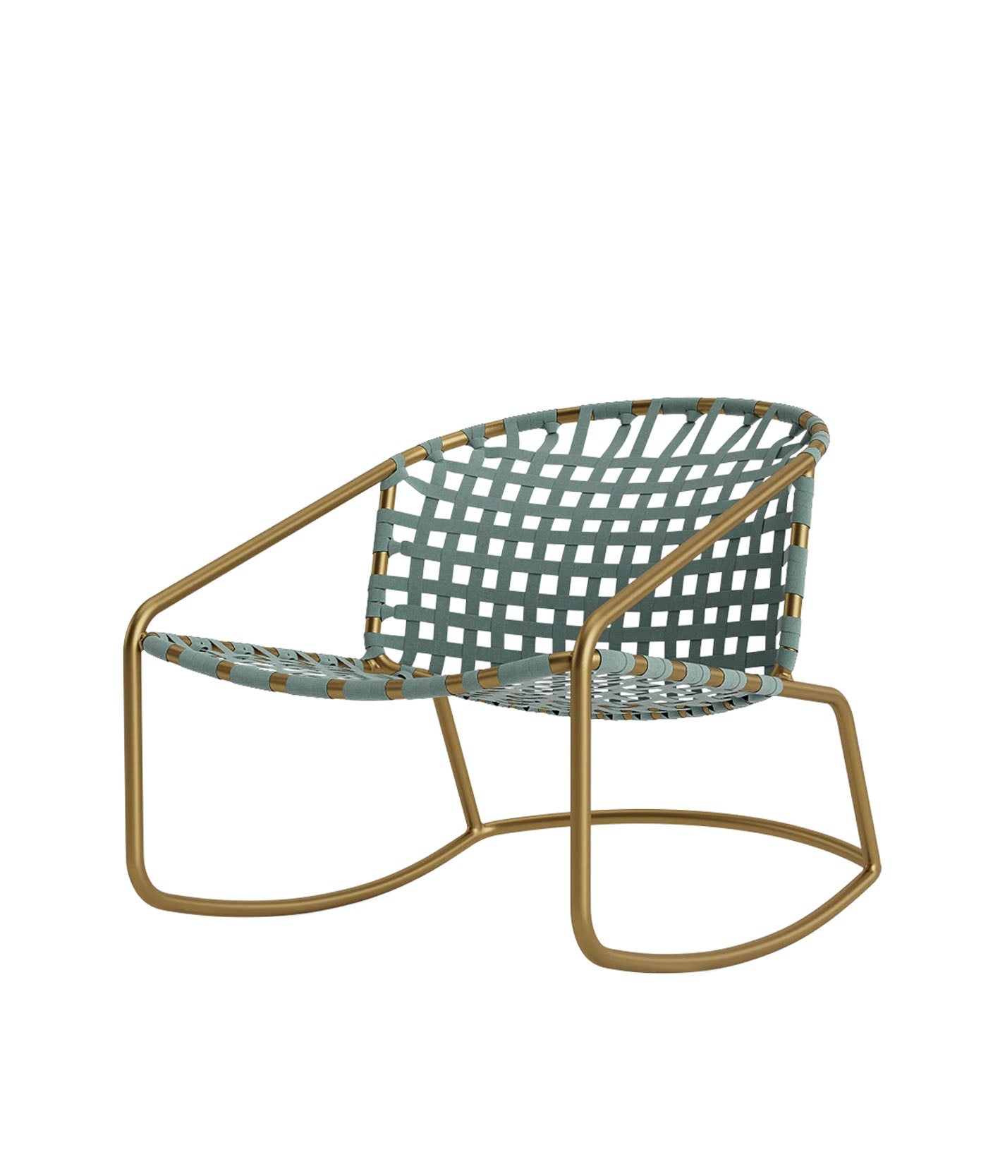 A sculptural mid-century rocker with a powder-coated aluminum frame and resilient Suncloth straps, offering ergonomic comfort and breezy Southern California style.