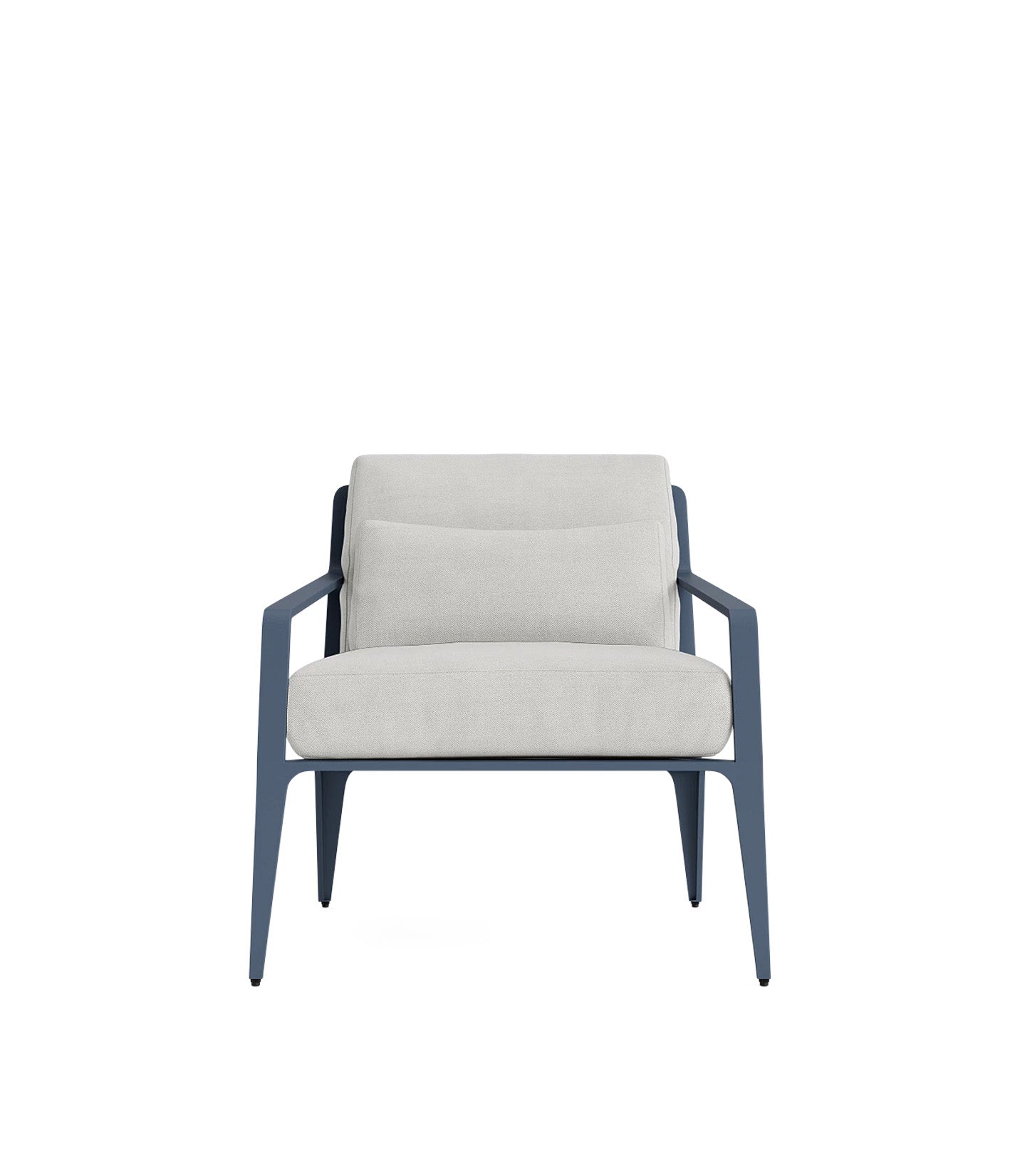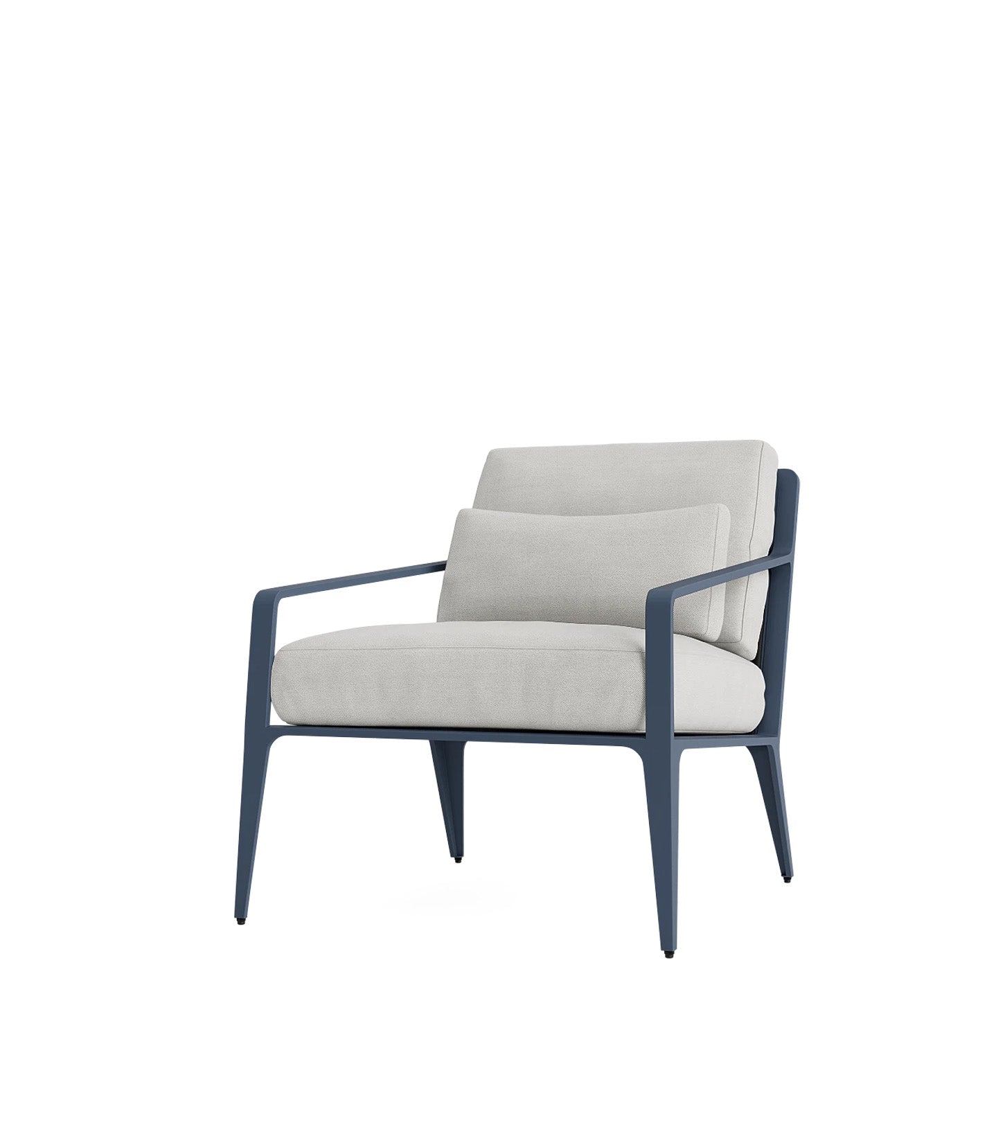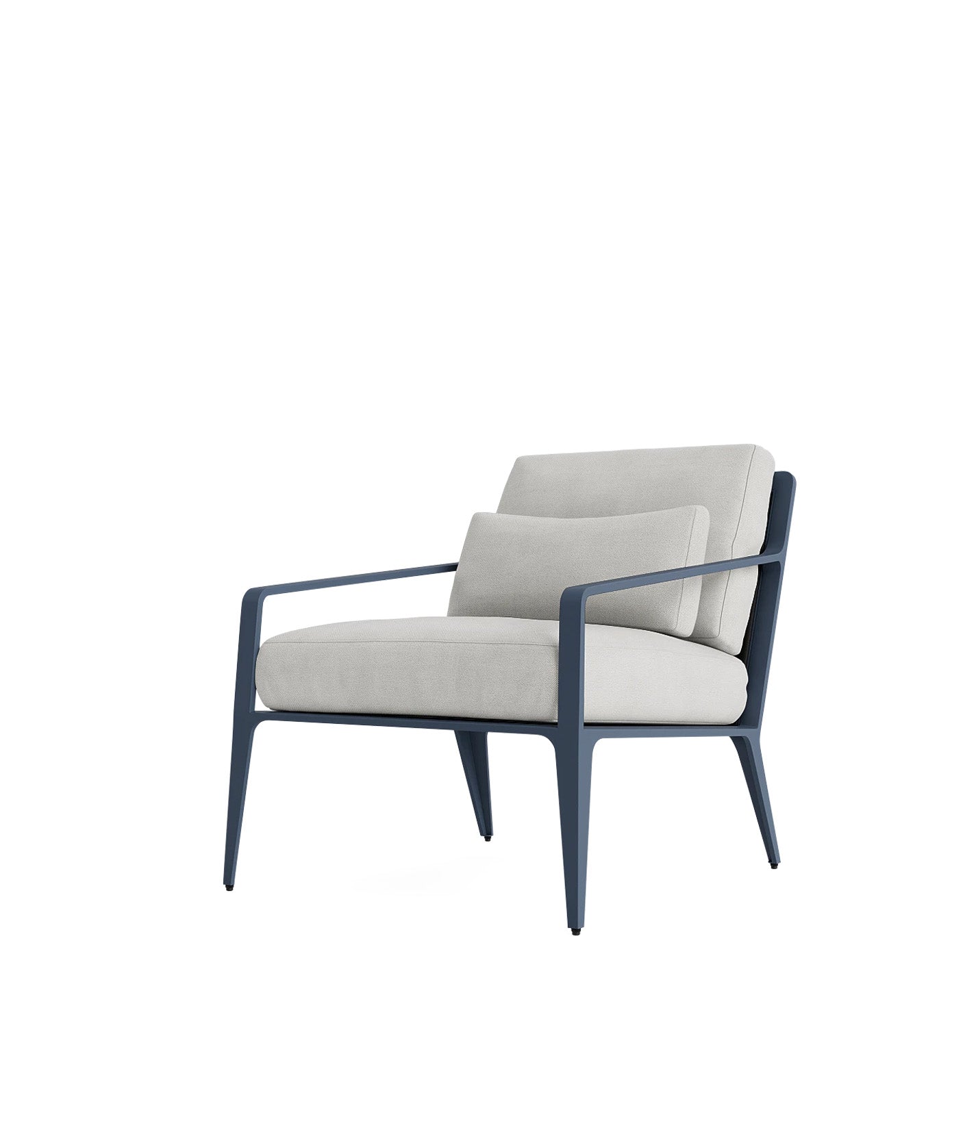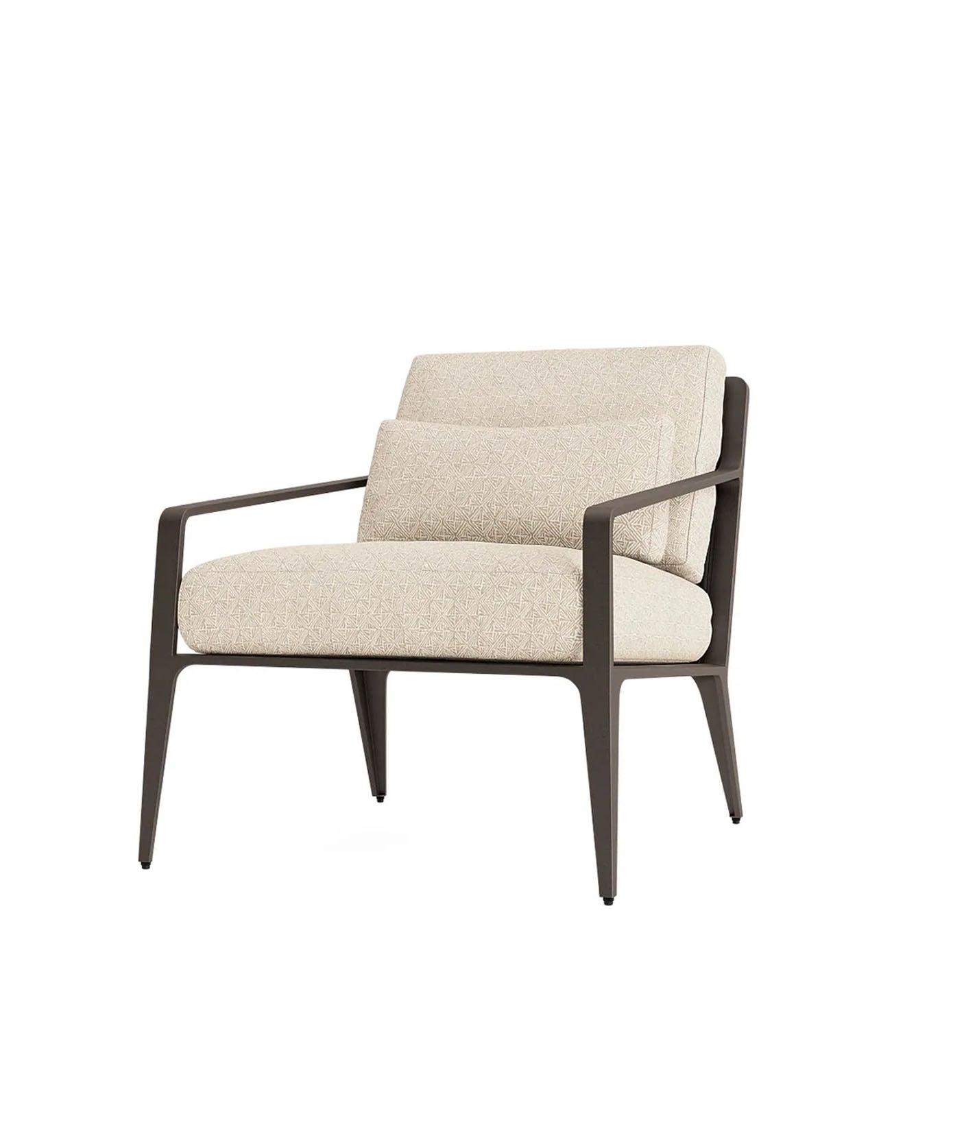 A sculpted lounge chair with softened edges and plush cushions, crafted from durable, high-performance materials that resist rust and sun damage, offering serene comfort year-round.