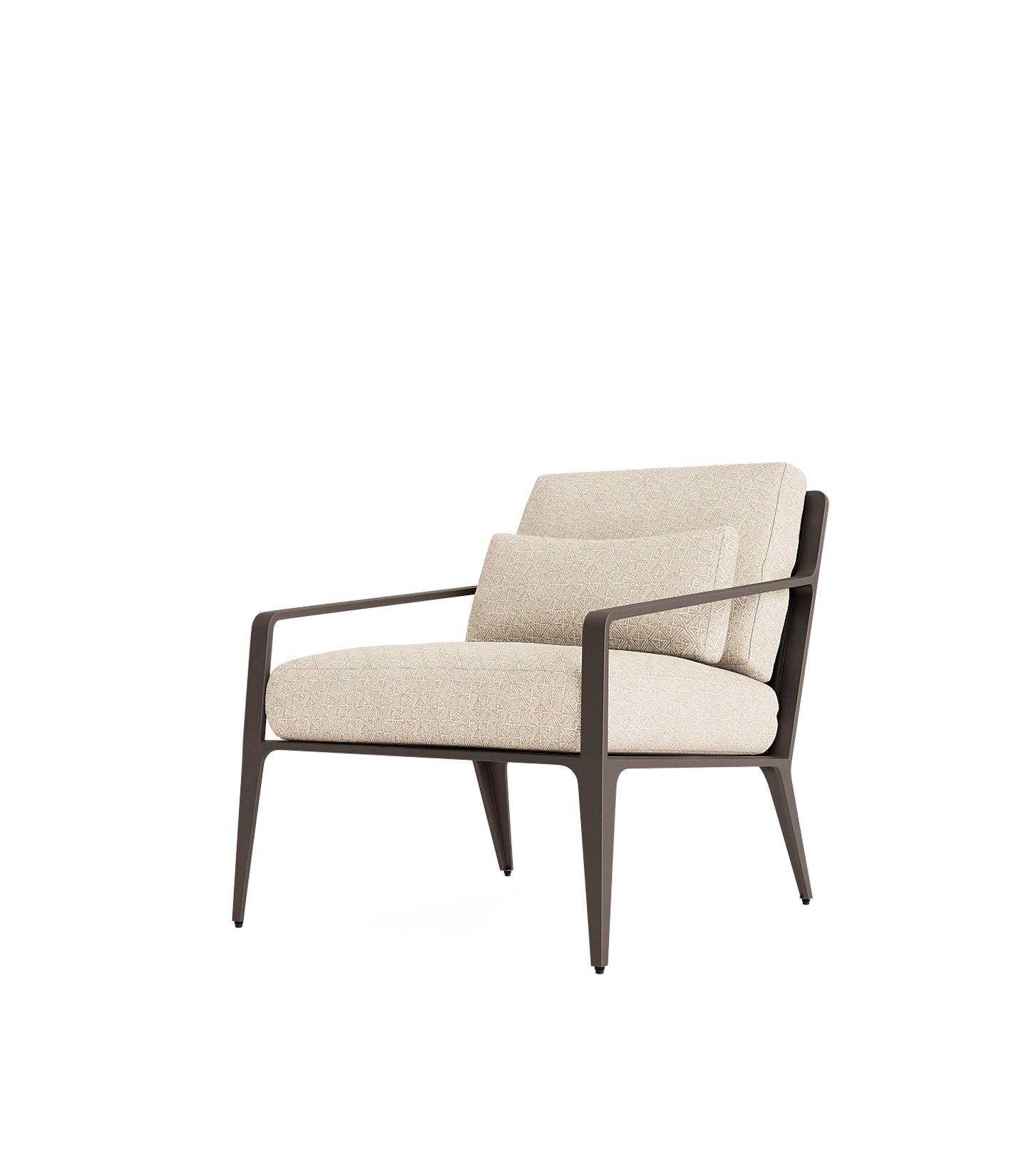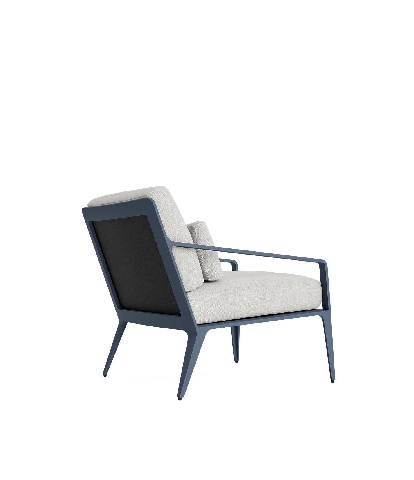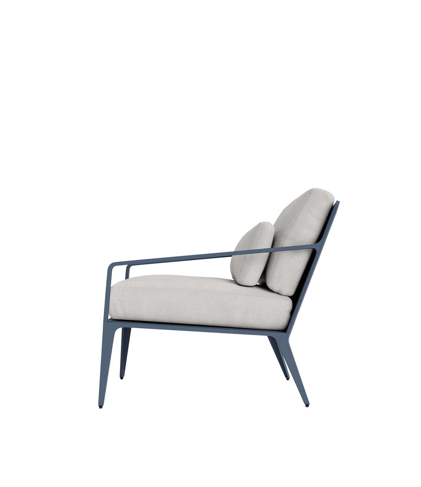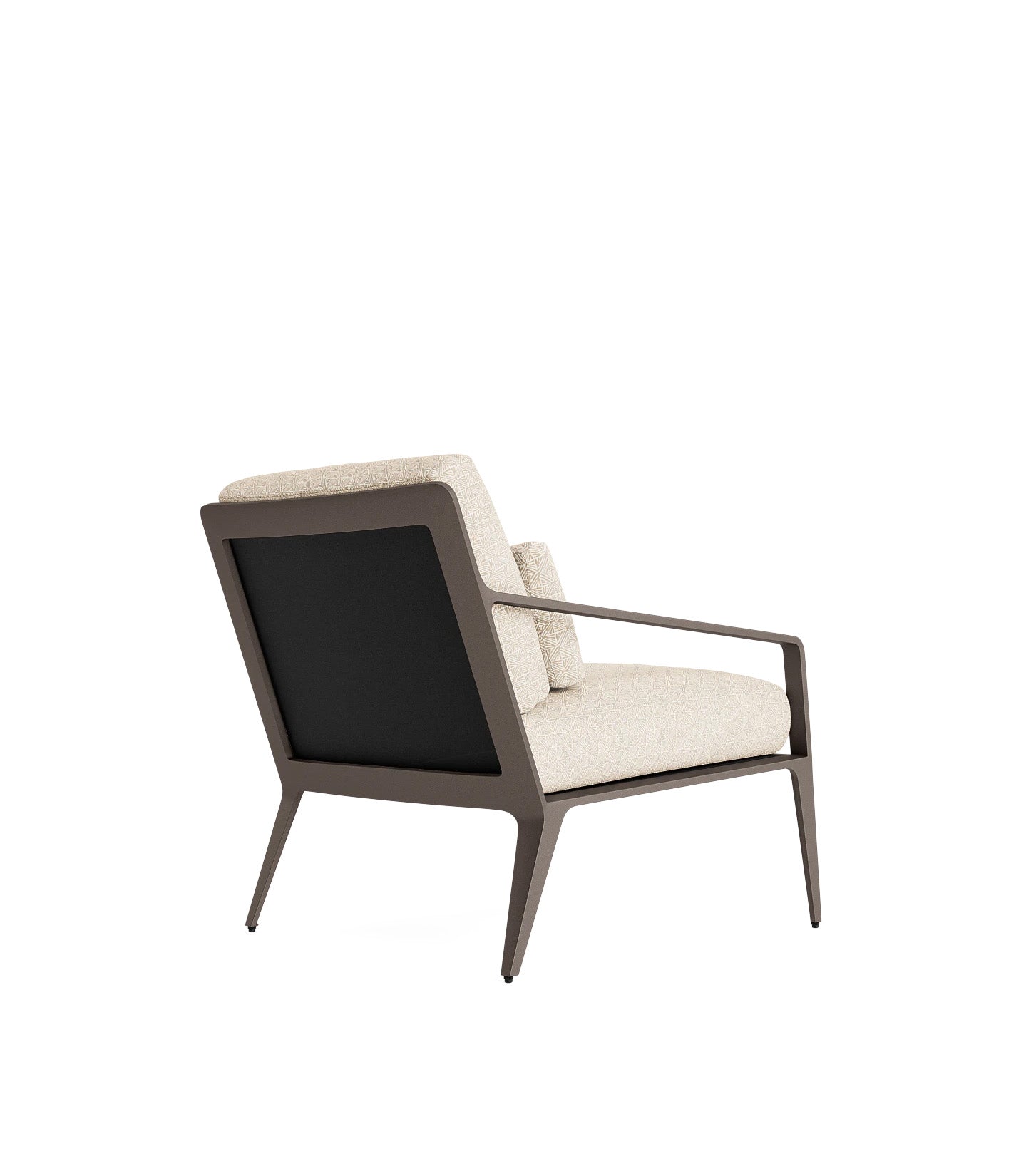 A sculpted lounge chair with softened edges and plush cushions, crafted from durable, high-performance materials that resist rust and sun damage, offering serene comfort year-round.