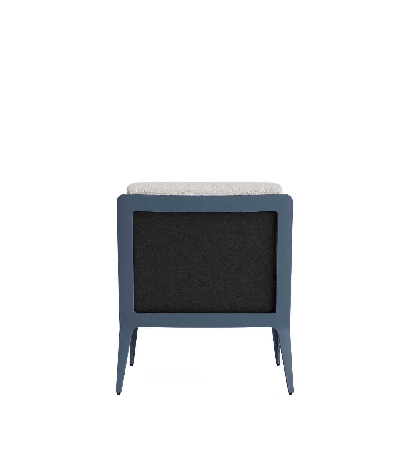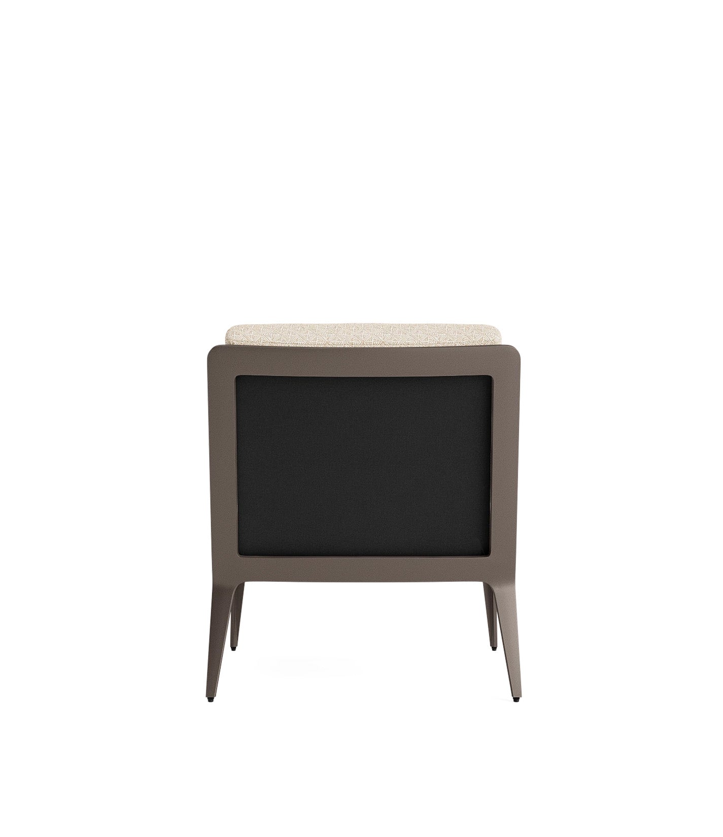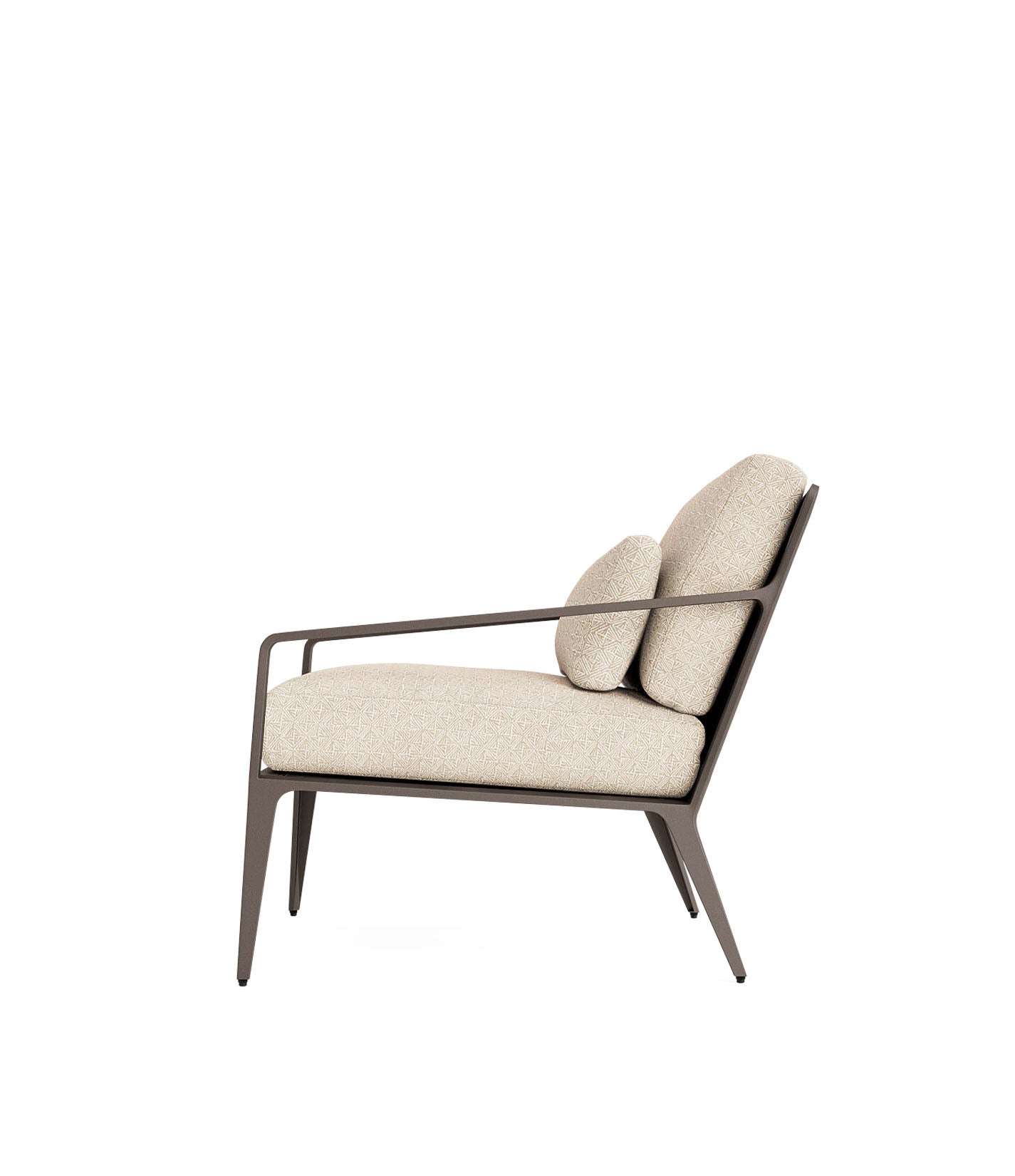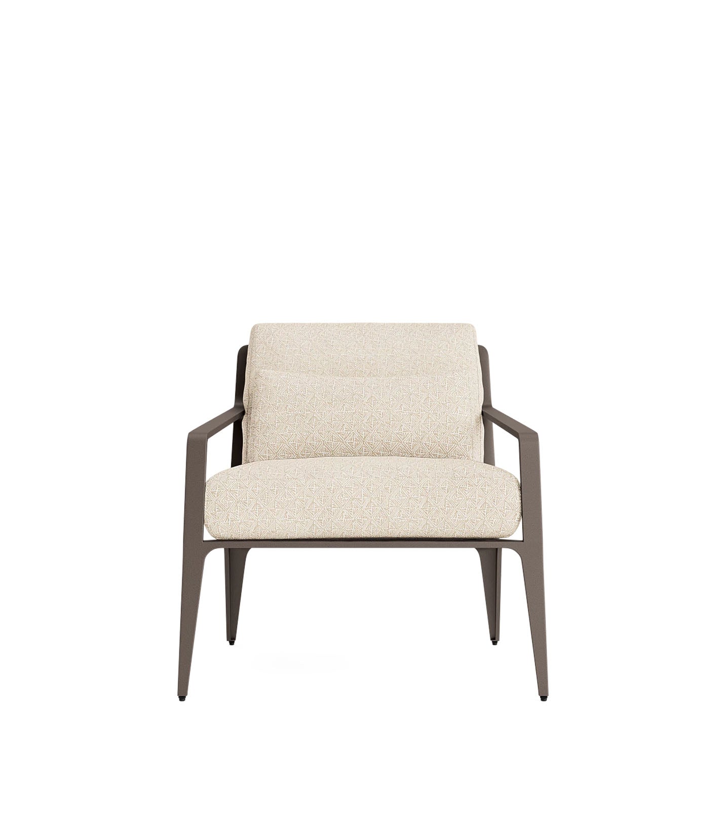 A sculpted lounge chair with softened edges and plush cushions, crafted from durable, high-performance materials that resist rust and sun damage, offering serene comfort year-round.