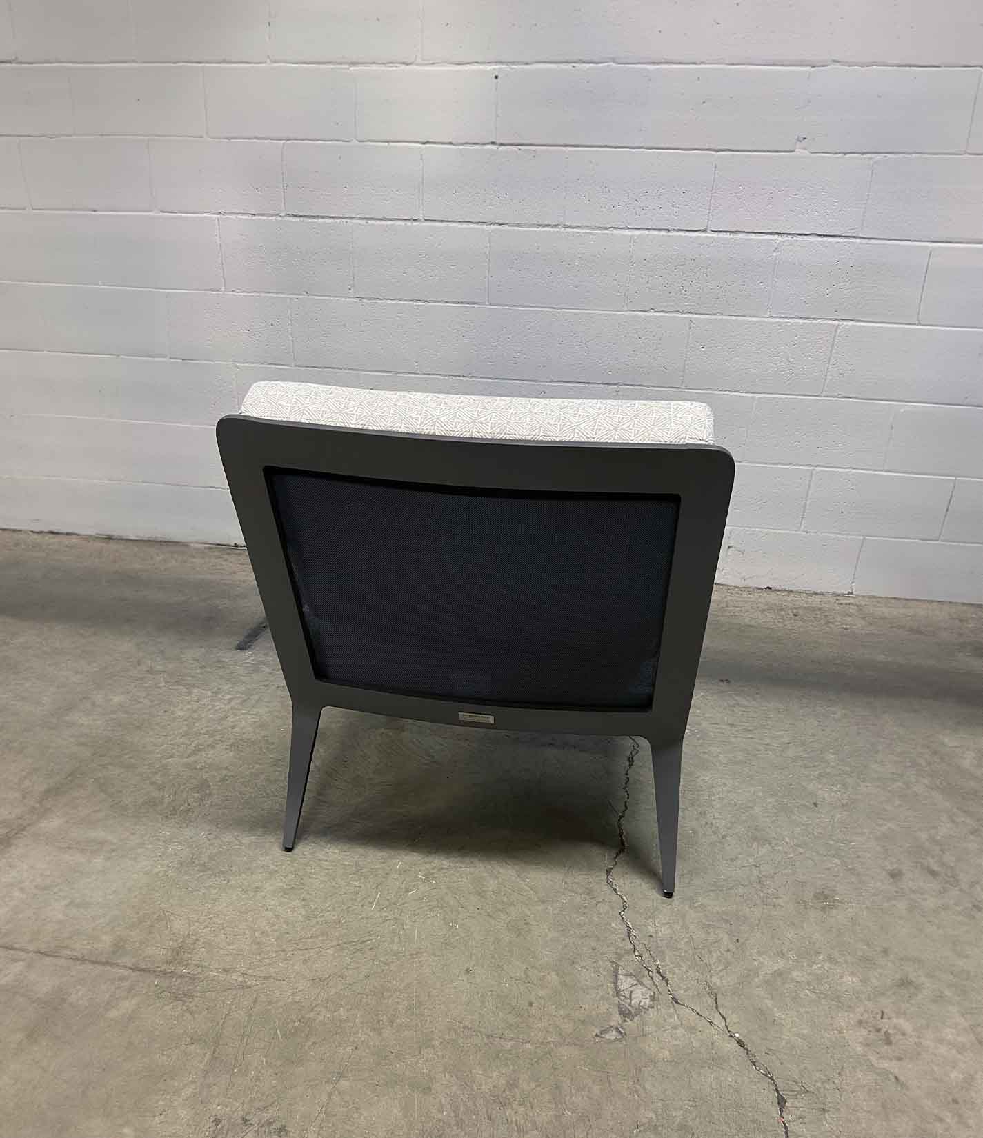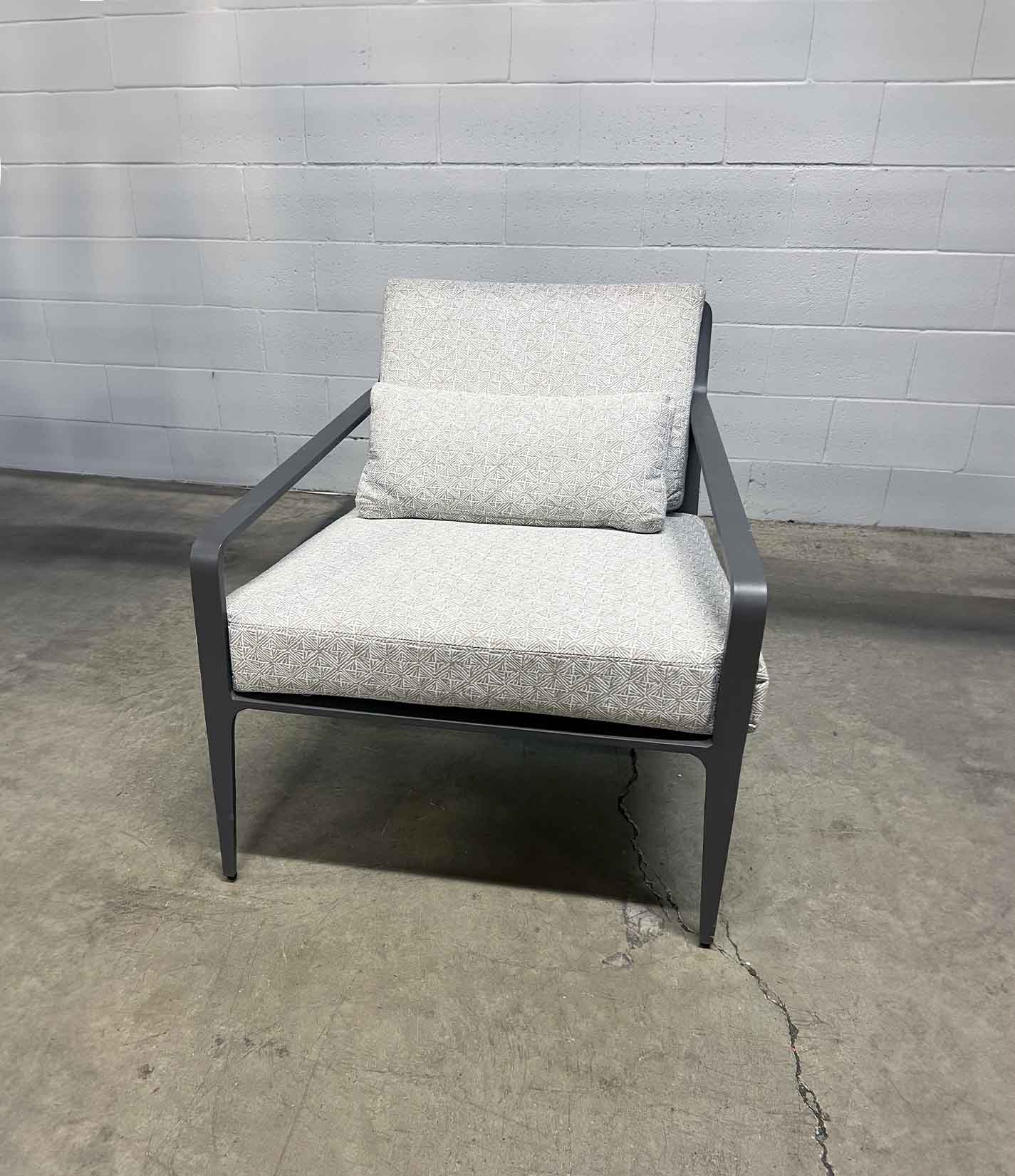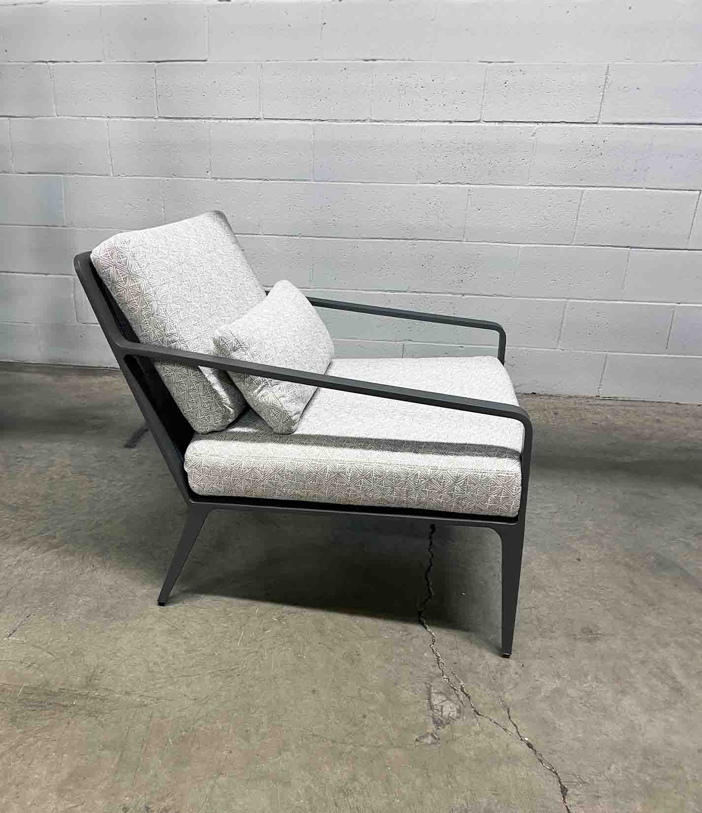 A sculpted lounge chair with softened edges and plush cushions, crafted from durable, high-performance materials that resist rust and sun damage, offering serene comfort year-round.