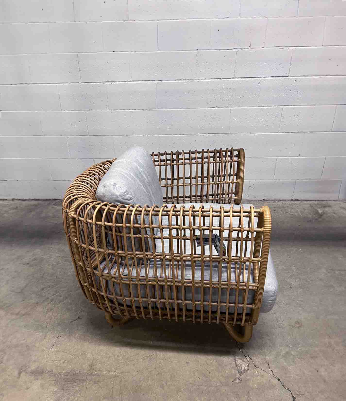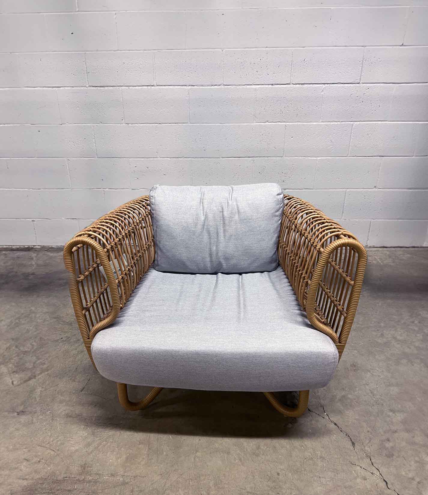 A sculptural outdoor lounge chair by Foersom & Hiort-Lorenzen MDD, featuring a durable Cane-line Weave® on a strong aluminum frame, offering timeless design and year-round comfort.