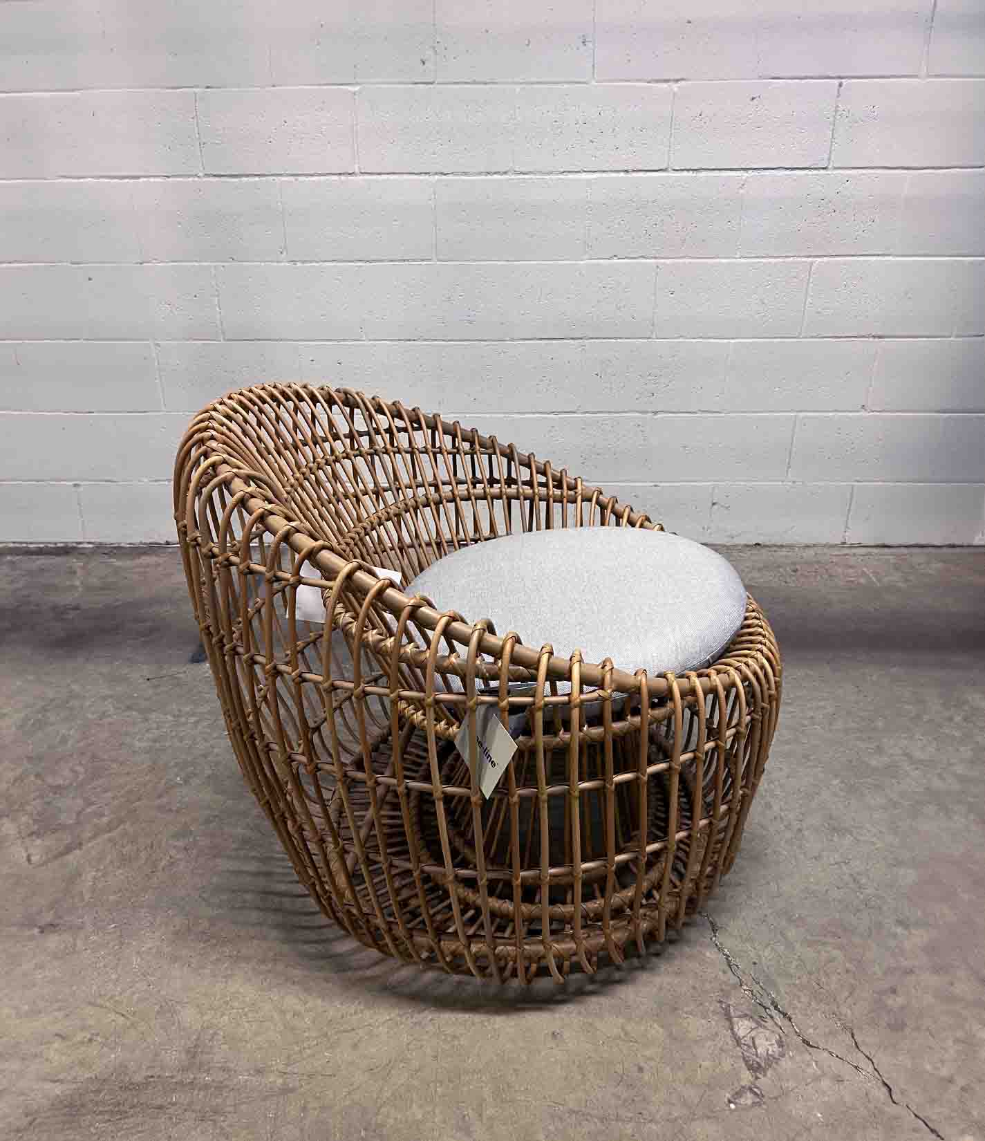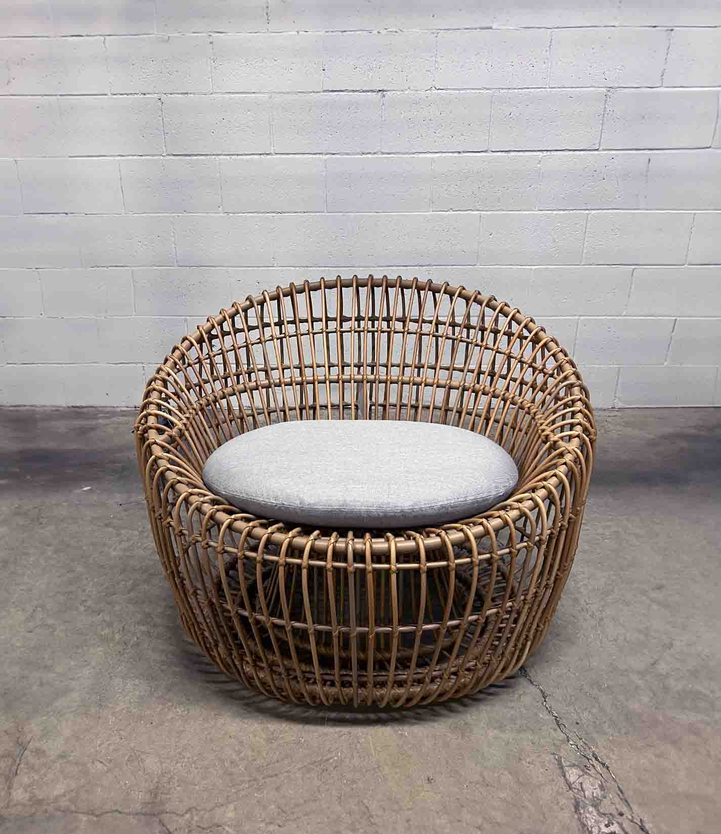 A sculptural outdoor lounge chair by Foersom & Hiort-Lorenzen MDD, featuring a durable Cane-line Weave® on a strong aluminum frame, offering timeless design and year-round comfort.