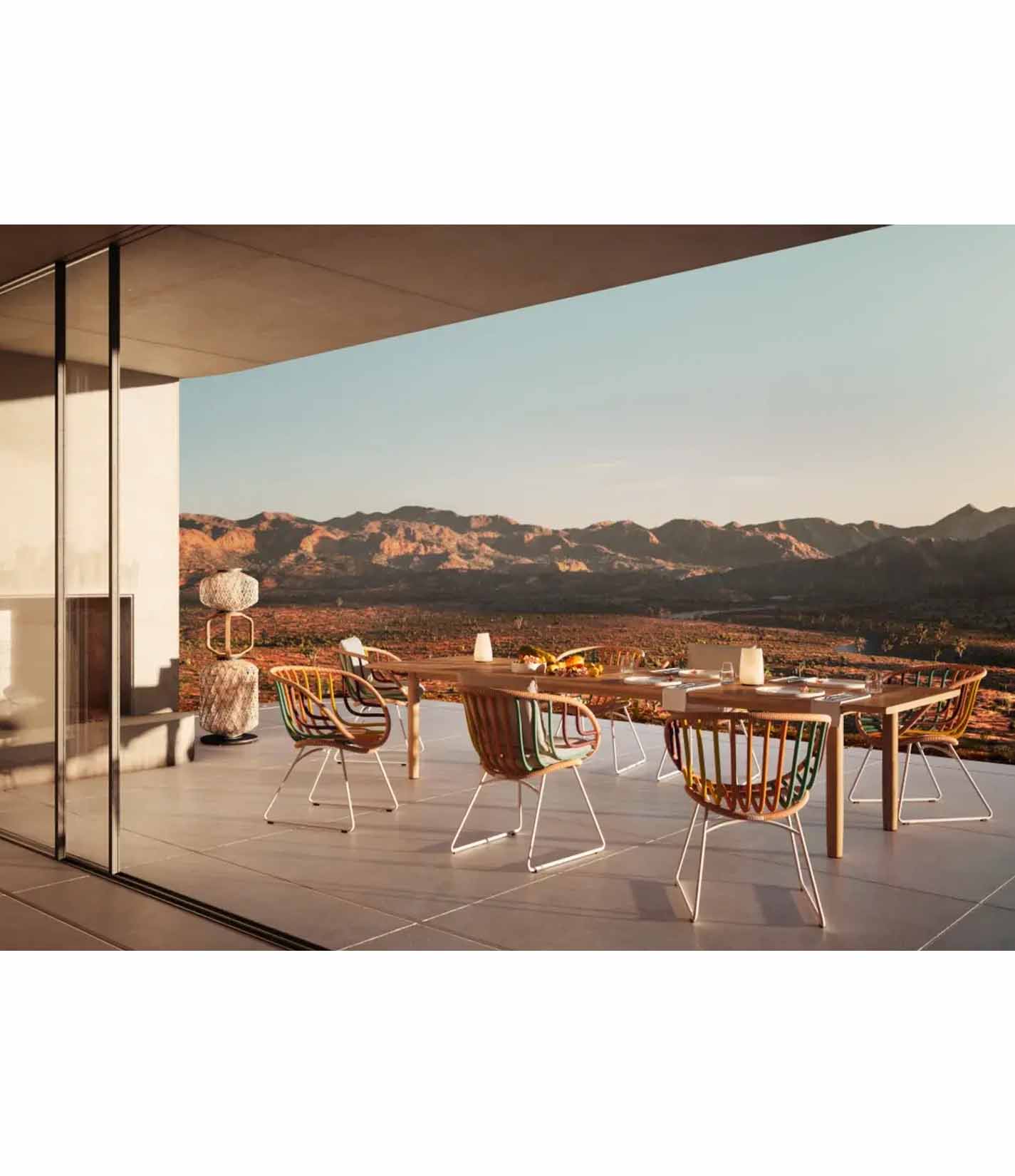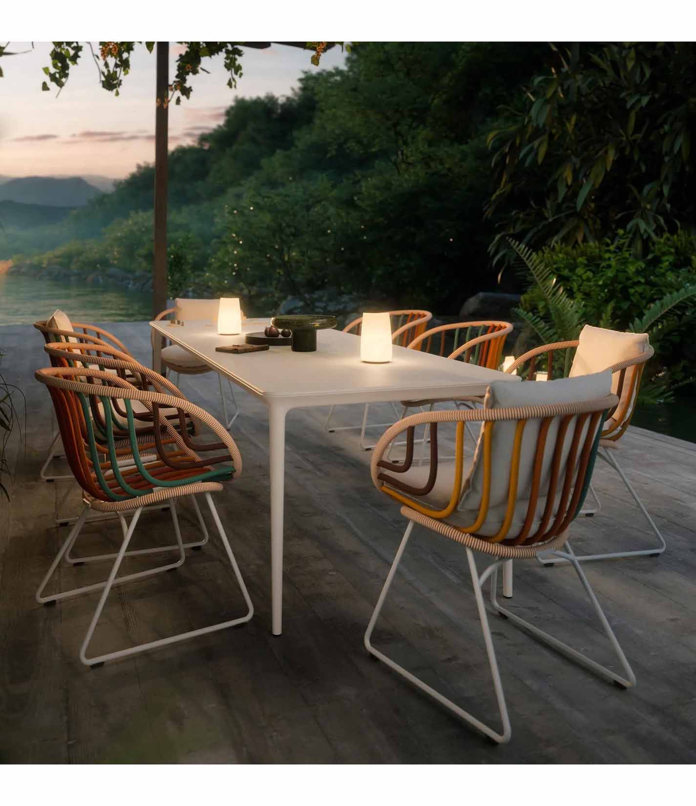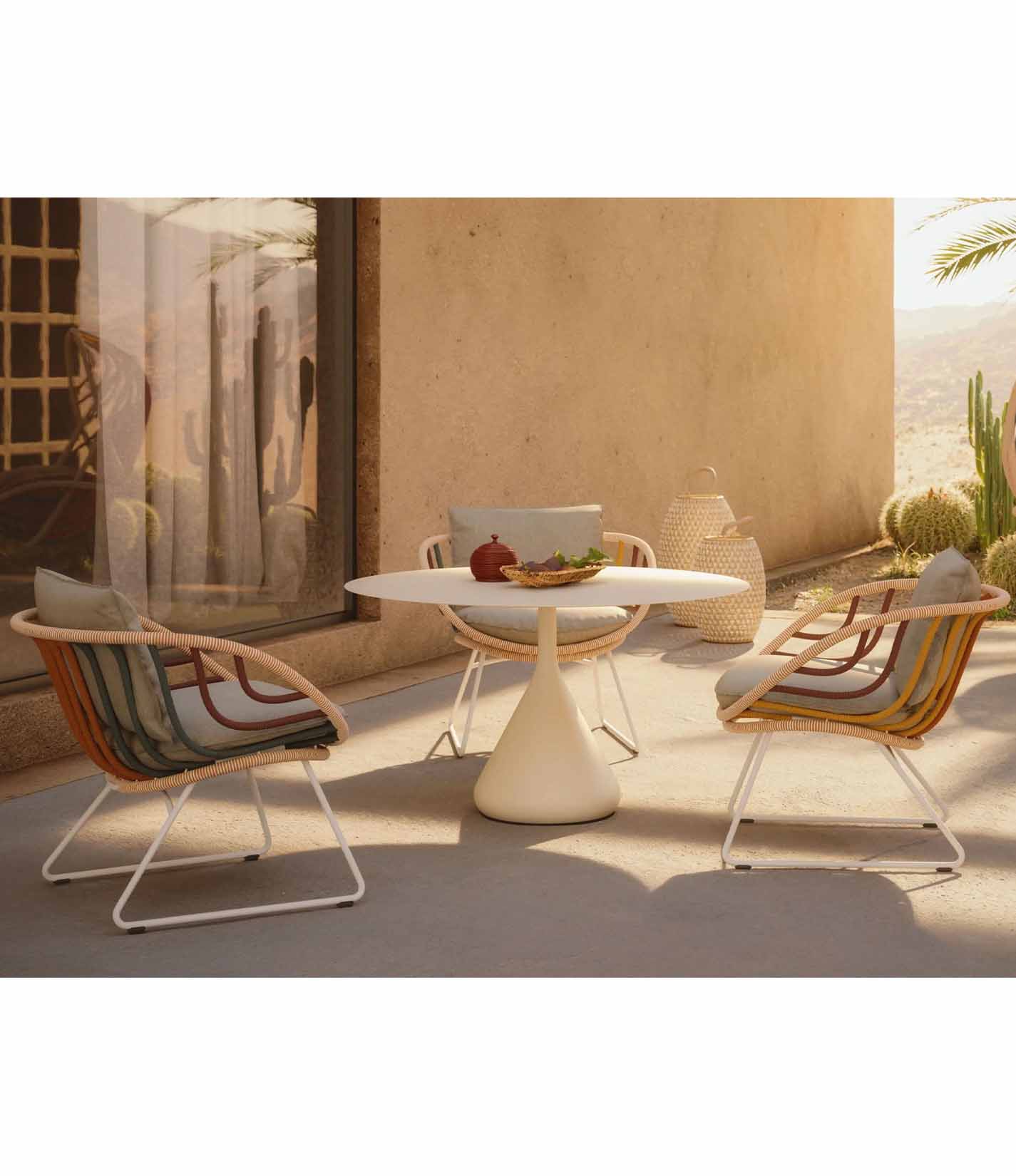 A sculptural lounge chair by Stephen Burks, featuring a cradle-like aluminum frame wrapped in soft-touch DEDON Fiber, with plush cushions for floating comfort indoors or out.