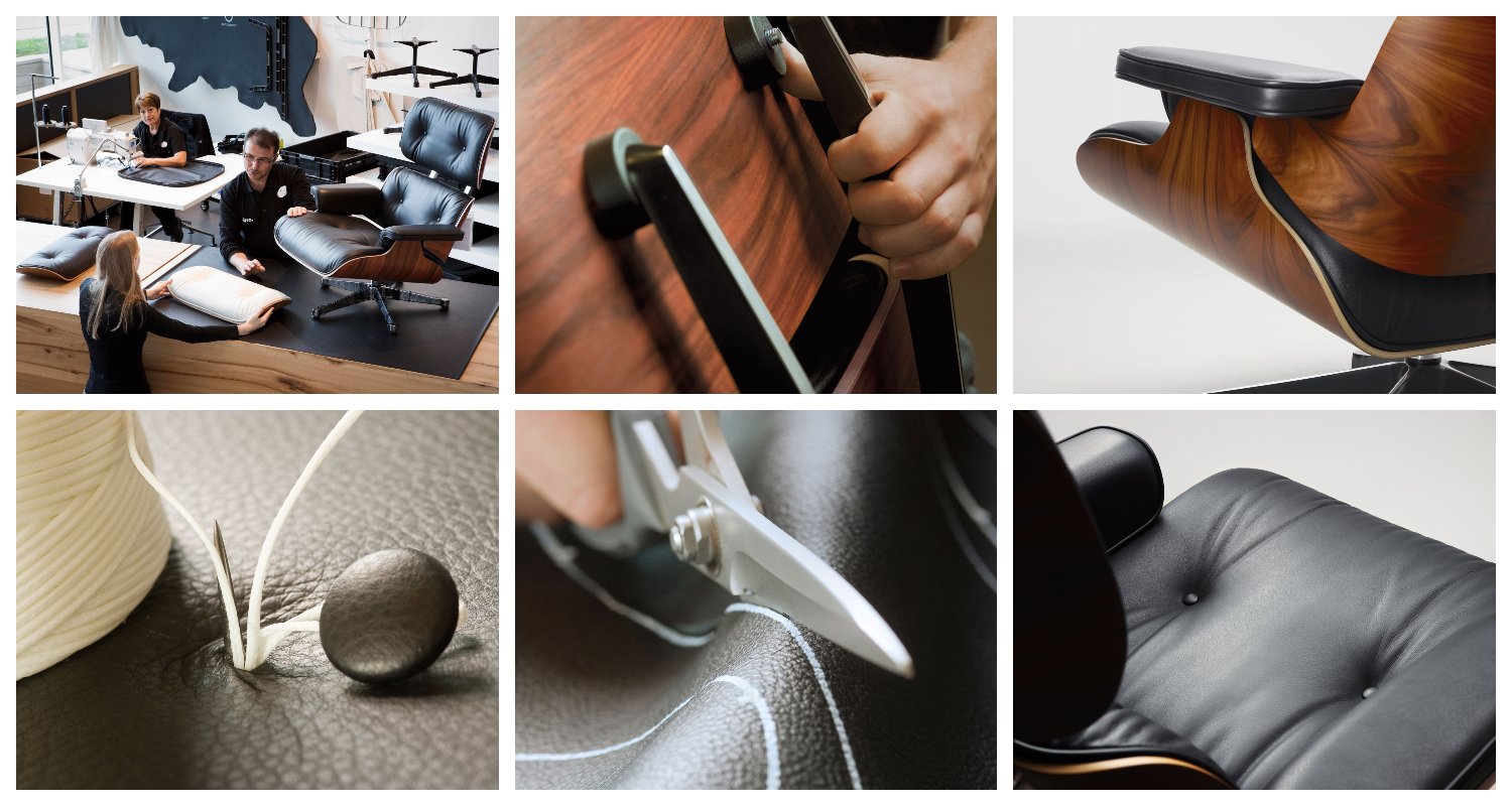 Both the chair and ottoman are hand-assembled with great attention paid to the details. Shells are 7-ply veneers. Cushions are individually upholstered and replaceable. The back braces and bases—of both the chair and ottoman—are die-cast aluminum. The chair base has a built-in swivel mechanism. Shock mounts are resilient natural rubber. Stainless steel glides are adjustable.
