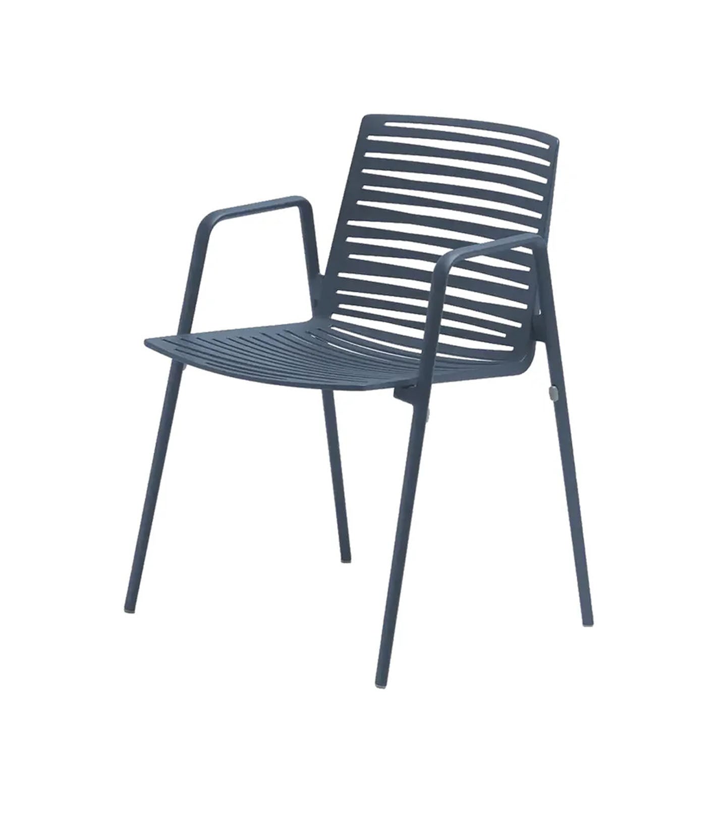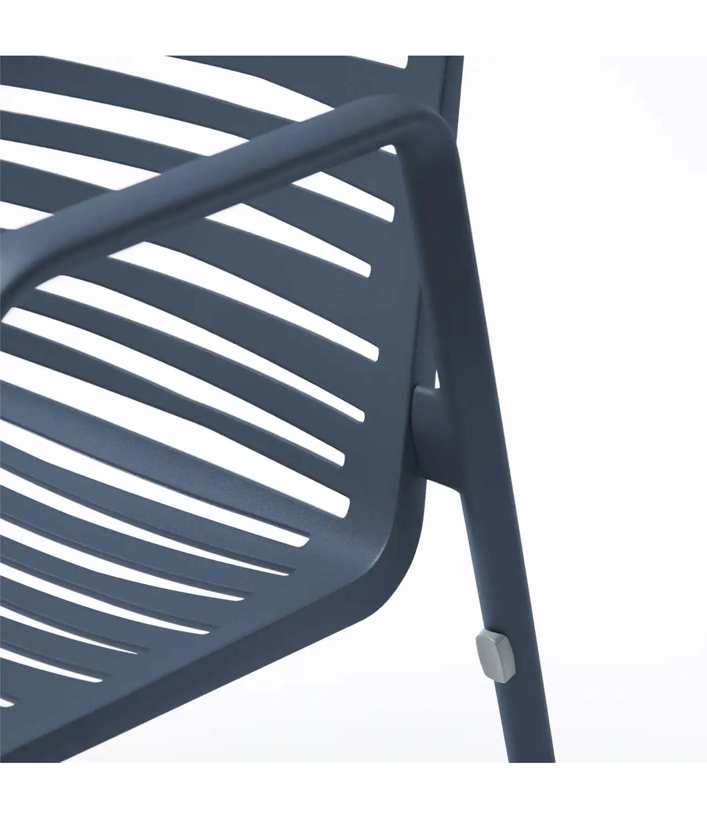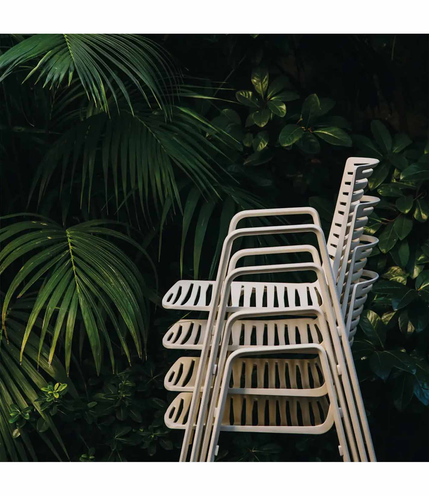A versatile all-rounder: clean-lined, stackable up to six, and ideal for both patio dining and contract settings. Its sculptural void pattern casts dynamic shadows and invites optional cushions for added comfort.