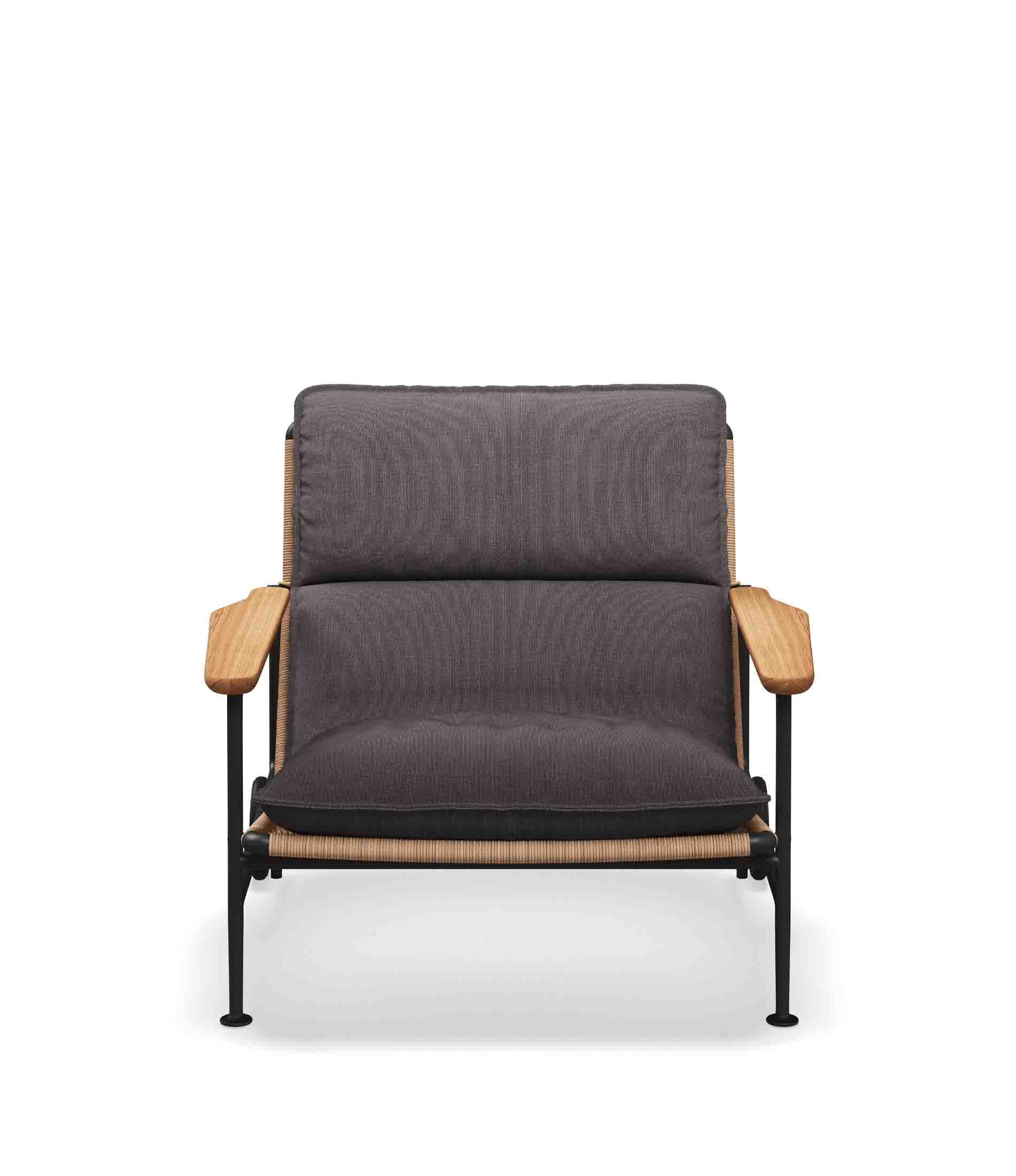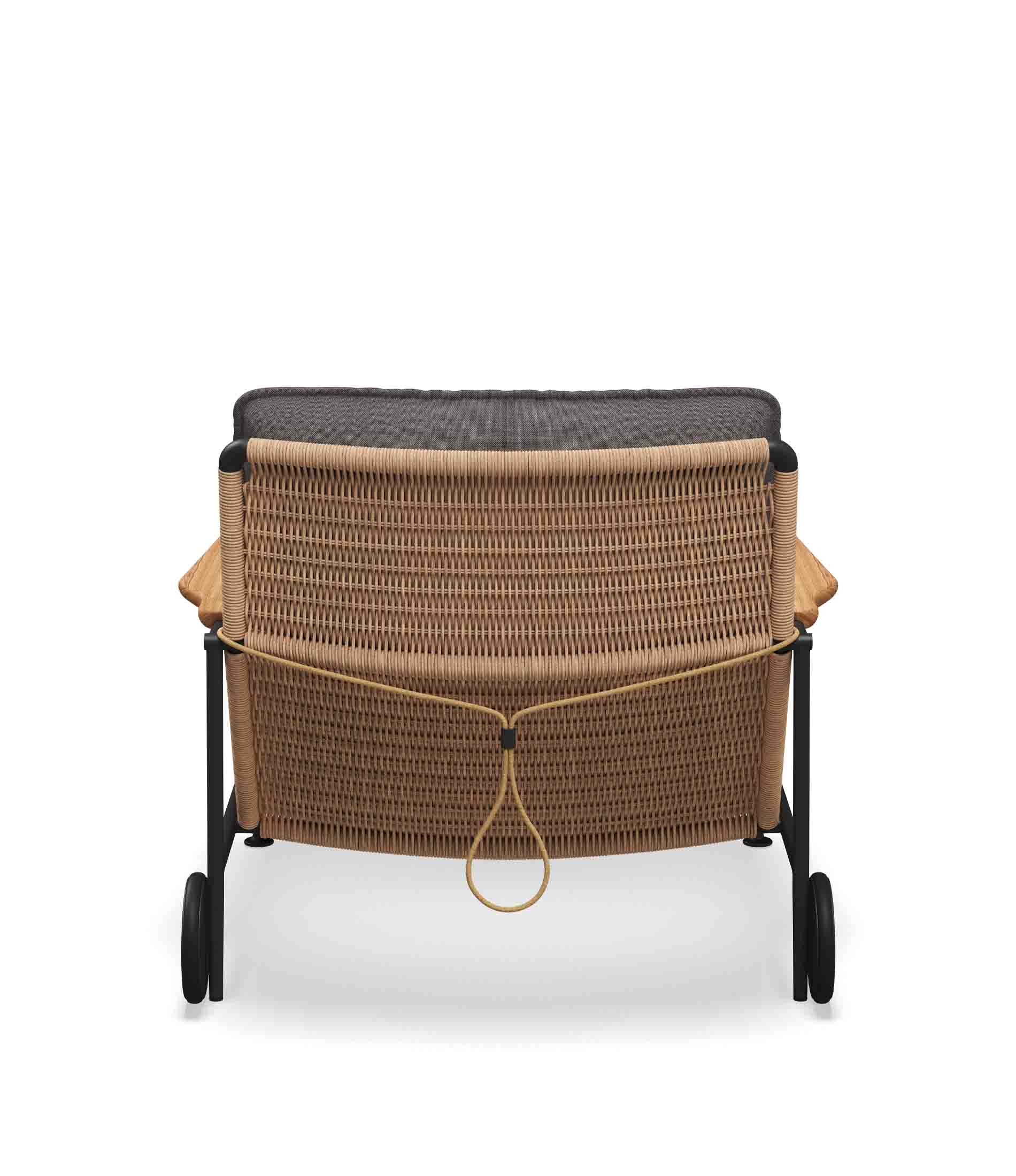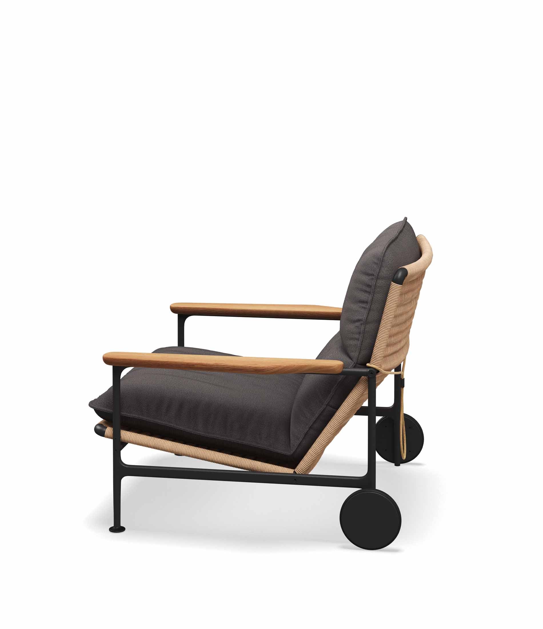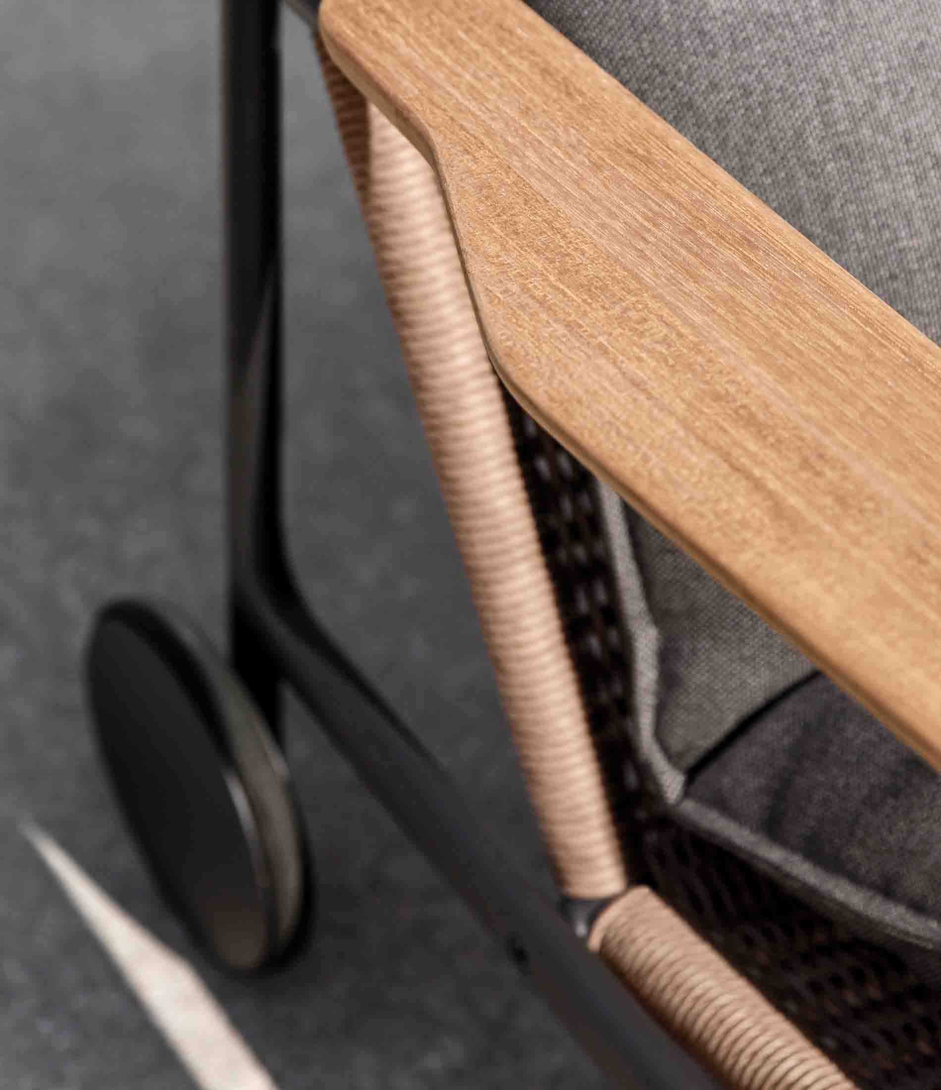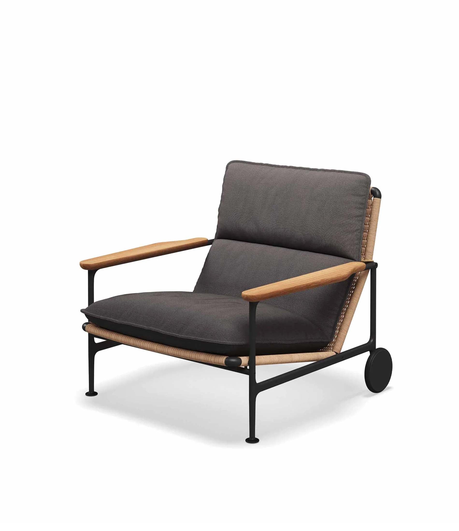 The Zenith Lounge Chair features a powder-coated aluminum frame, an all-weather wicker seat and back, and teak armrests. Durable, lightweight, and easy to move—ideal for stylish, low‑maintenance outdoor lounging.