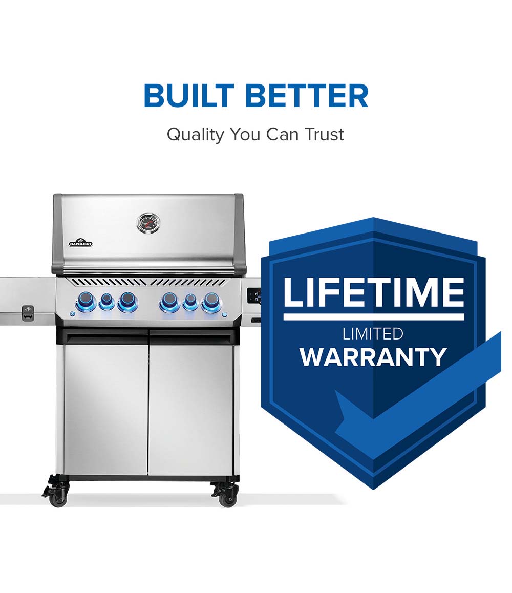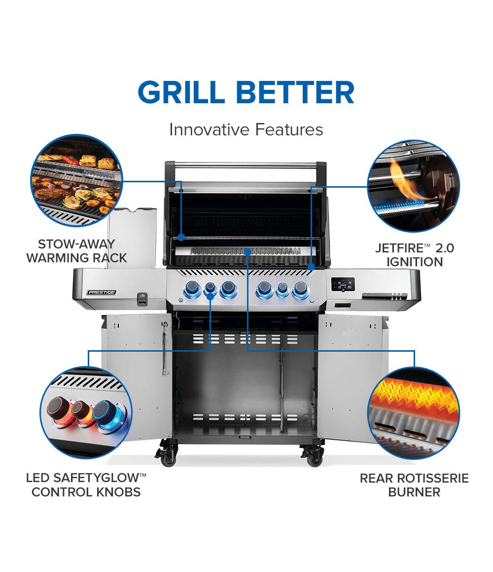 The Napoleon Prestige® 500 seamlessly blends high-performance grilling with sleek, modern design. Crafted entirely from stainless steel, it offers durability and style for your outdoor cooking space. With its spacious cooking area and advanced features, this grill is designed to meet the needs of both casual grillers and seasoned barbecue enthusiasts.