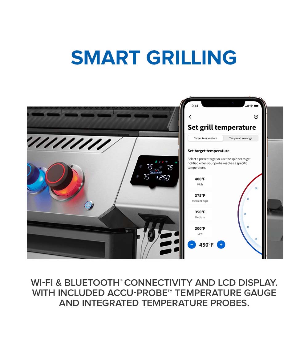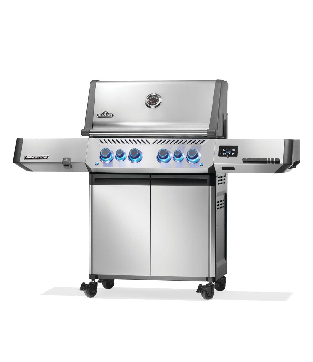 The stainless steel Prestige 500 Connected Grill features Wi-Fi/Bluetooth connectivity, letting you monitor temps, set timers, and get cook alerts via smartphone. It includes temperature probes, an LCD display, rear rotisserie burner, infrared sear station, and side burner—offering precision and power for every cookout.