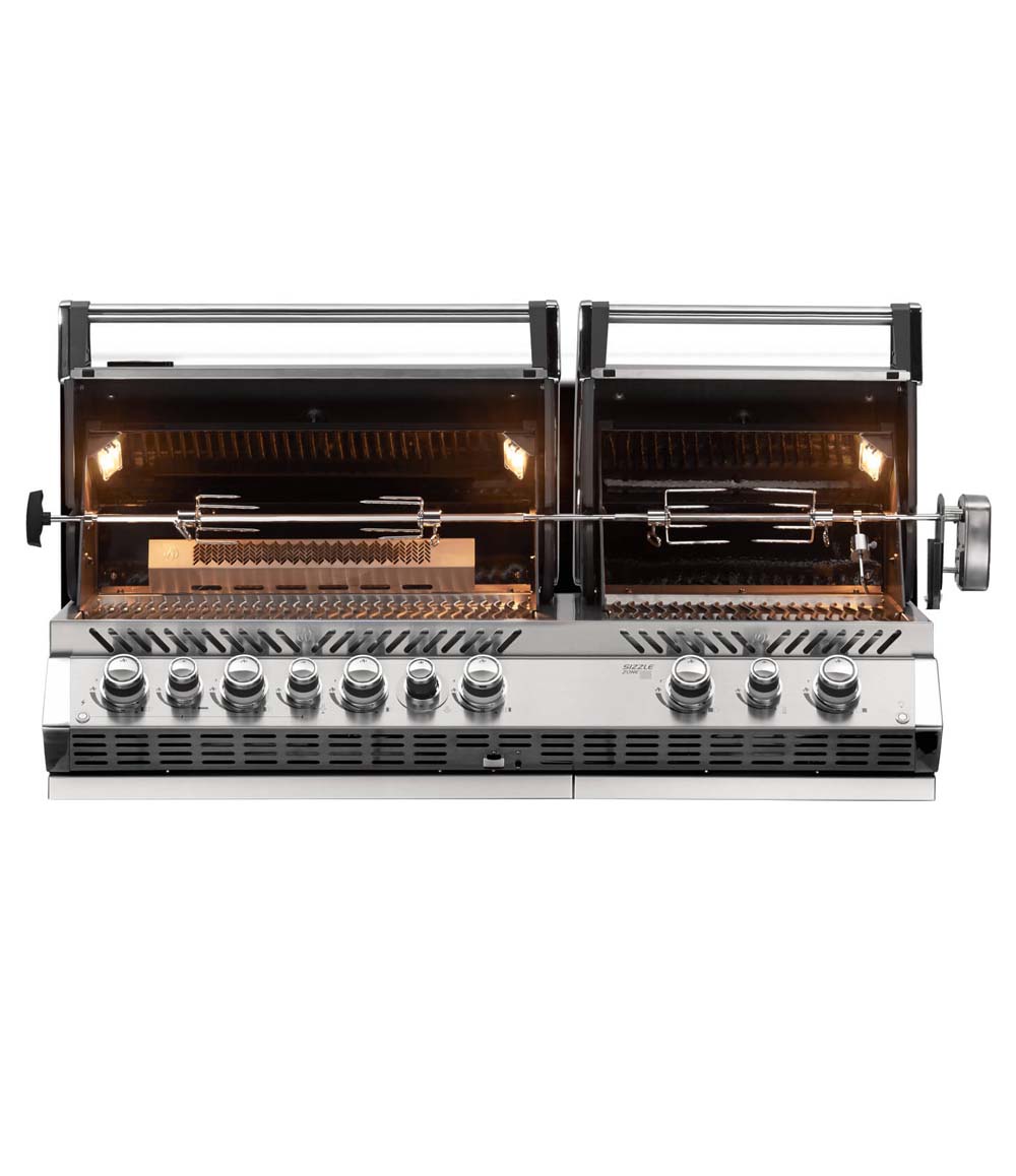 The Napoleon Built-In Prestige PRO™ 825 RBI is the pinnacle of outdoor grilling, combining expansive cooking capacity with refined design. Featuring dual grill heads, it offers unparalleled versatility, allowing for high-heat searing, rotisserie cooking, and smoking. Constructed with premium stainless steel and chrome accents, this grill is designed to be the centerpiece of any outdoor kitchen. Advanced features like the RGB Spectrum NIGHT LIGHT™ control knobs and proximity lighting enhance both functionality and ambiance, ensuring an exceptional grilling experience day or nigh