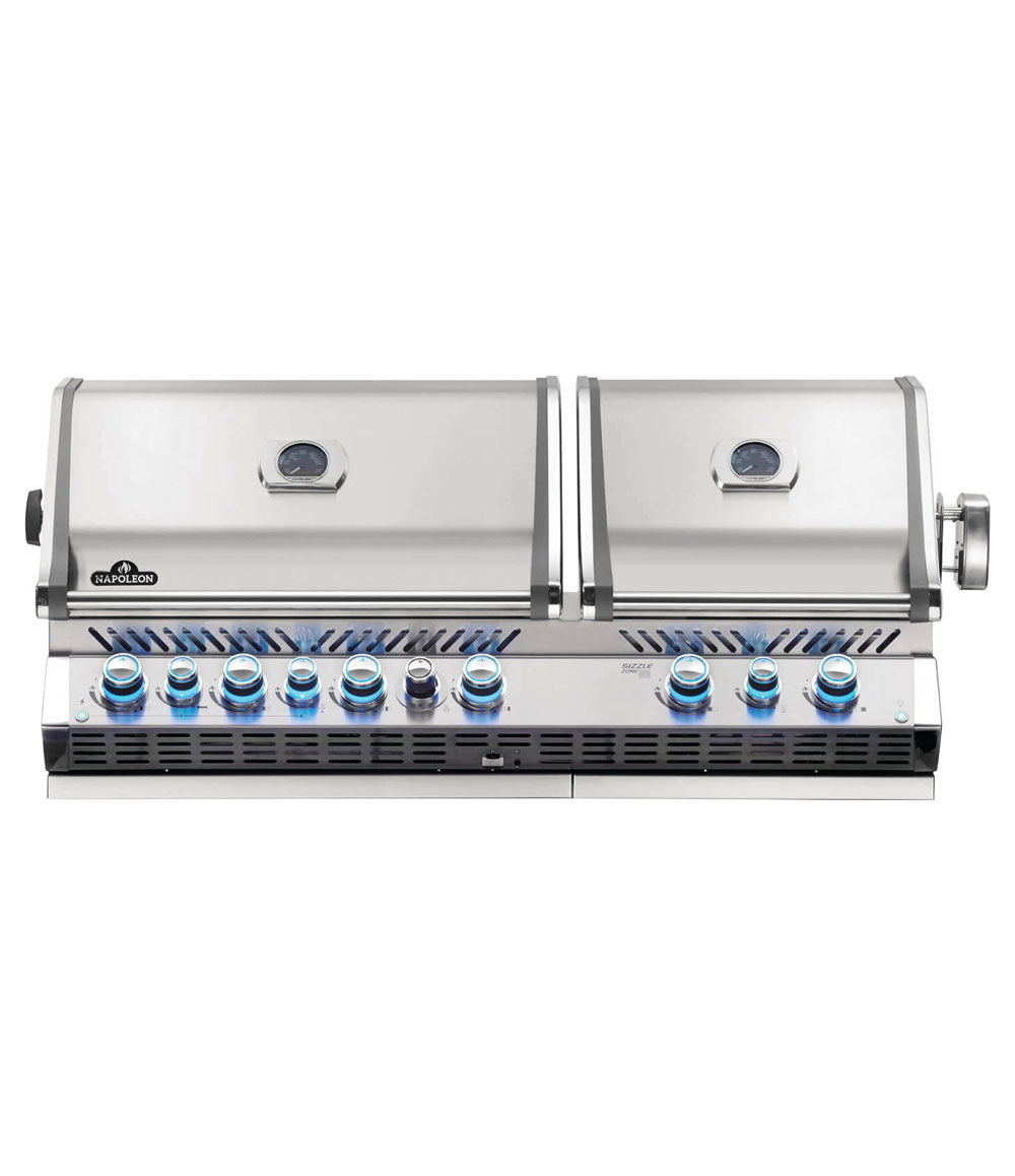 The Built-In Prestige PRO™ 825 combines luxury and performance with dual grill heads, infrared burners, a smoker tray, and LED NIGHT LIGHT™ knobs. Finished in stainless steel, it's the centrepiece of any refined outdoor kitchen.