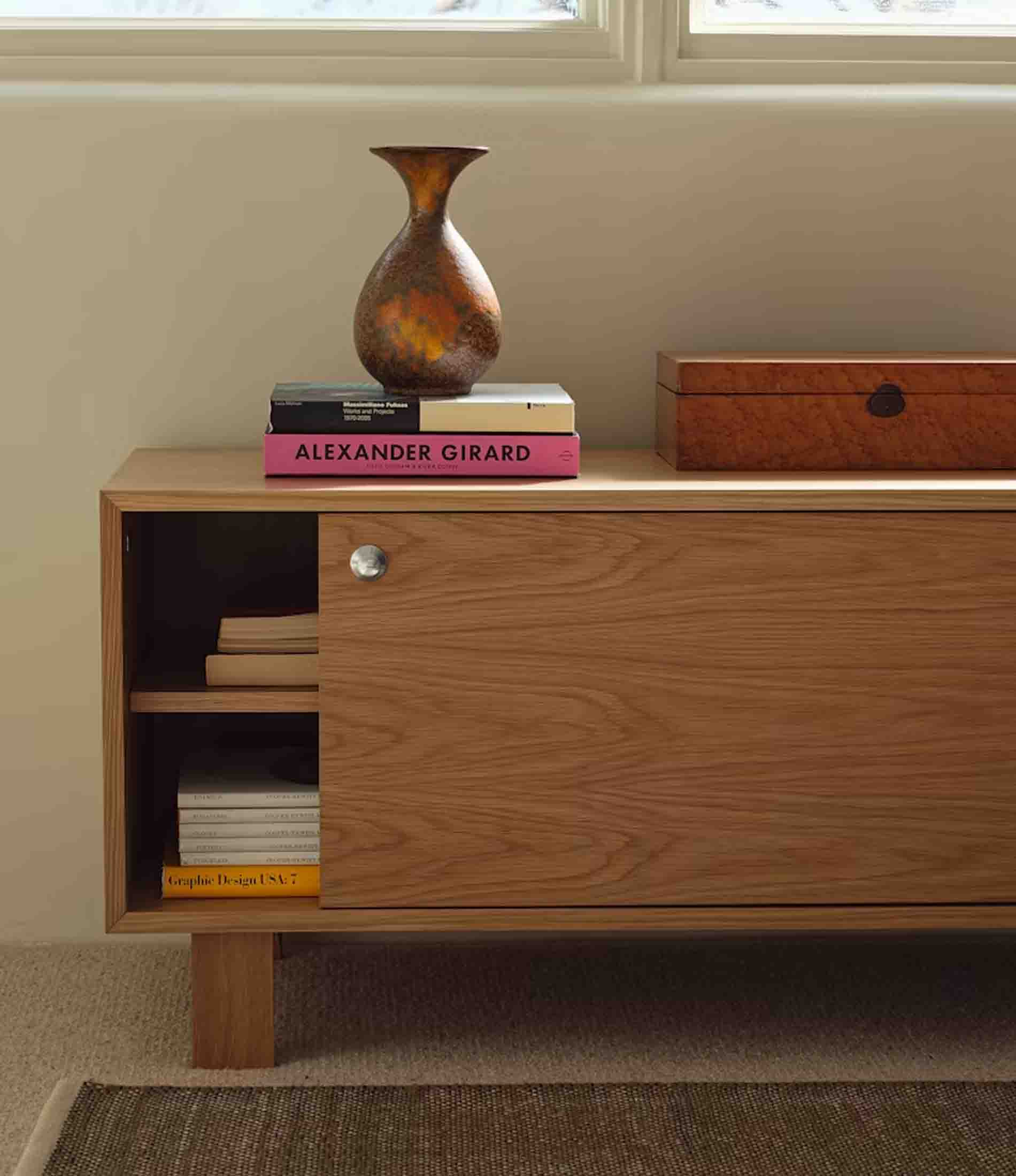 First introduced in 1946, the re-issued Nelson Basic Cabinet Series exemplifies simplicity and expert craftsmanship. The Nelson Basic Media Unit offers sleek, customizable storage tailored for modern entertainment systems. As part of a six-piece collection, this adaptable George Nelson design evolves with your space, providing timeless organization and refined style for any home.