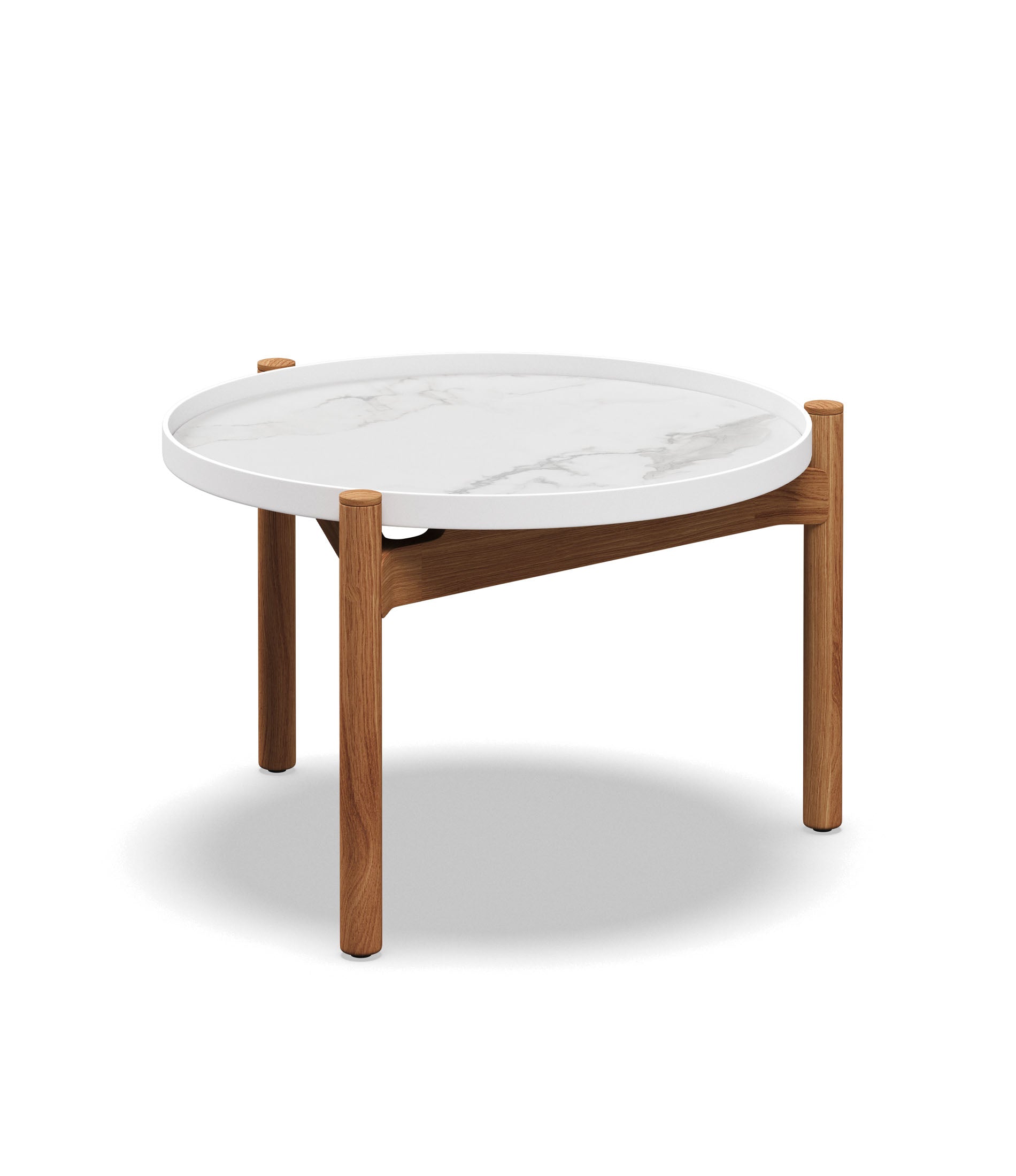 Elegantly combining natural teak and refined materials, the Sepal Side Table by designer Mark Gabbertas draws inspiration from the form of a floating water lily—its softly upturned ceramic top resting on a perfectly proportioned teak frame.
