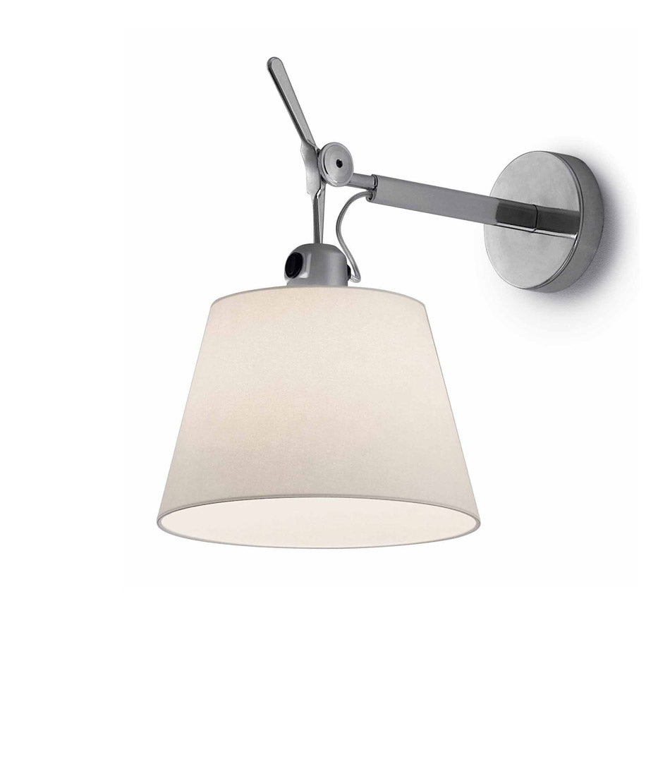 The Tolomeo 7-10-12 Shaded Wall Light is adjustable for direct and diffused lighting. Features aluminum wall supports, joints, canopy and arm with an aluminum framed diffuser. The fixture adjusts to full downward and maximum 30 degree upward positions. Mounts to a standard junction box. Available with parchment paper or pale grey satin/polycarbonate fiber blend shades in 7, 10 or 12 inch diameters.