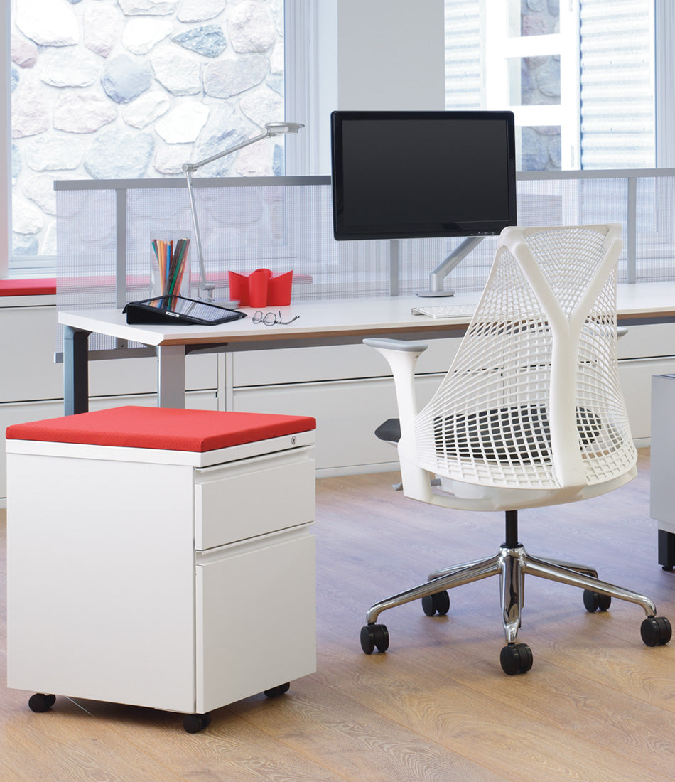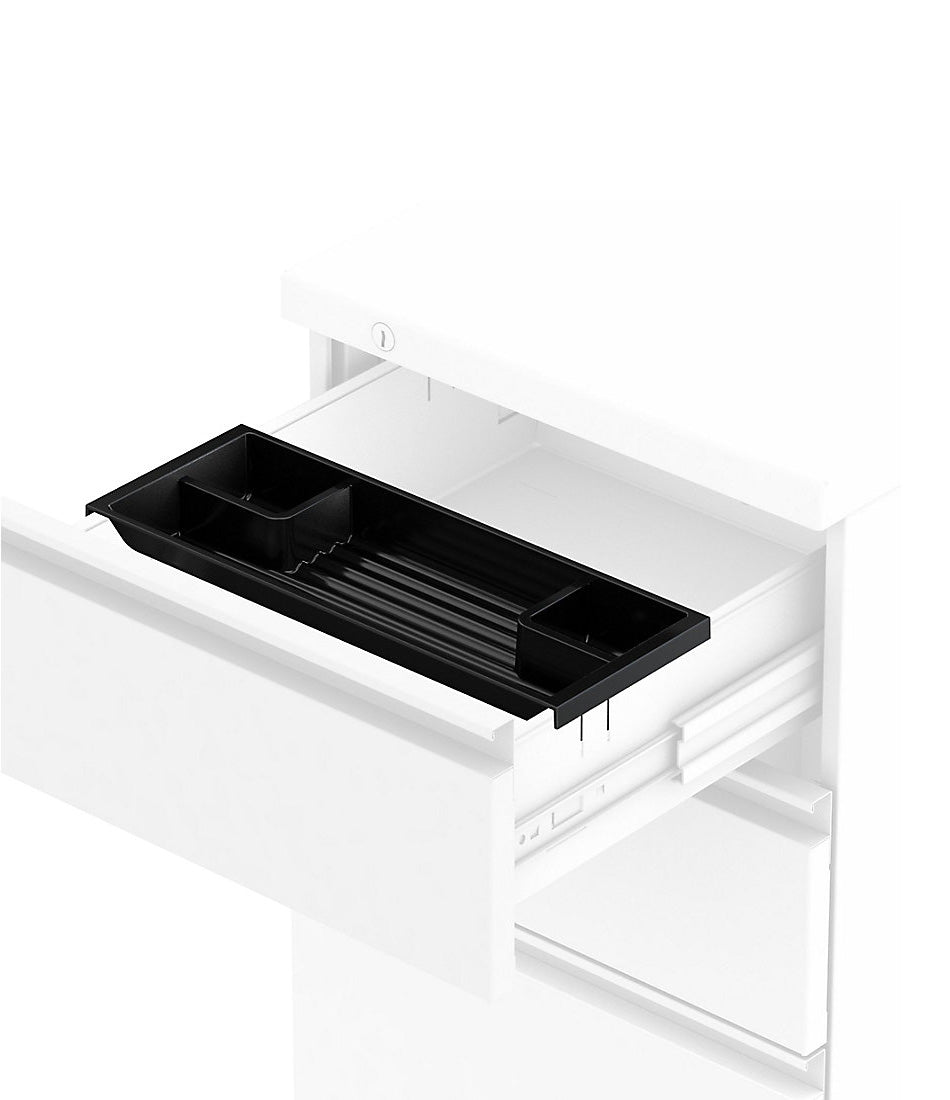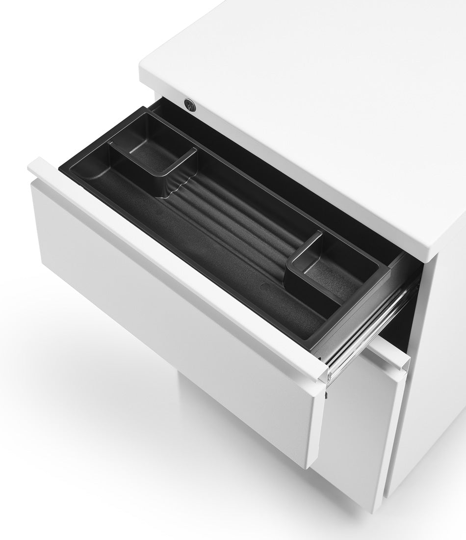 The Tu Pedestal Utility Tray sits neatly at the top of the drawer, leaving usable space to store bulkier items below.