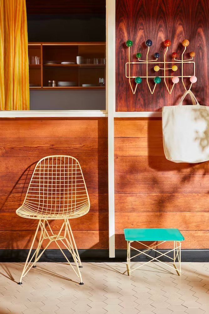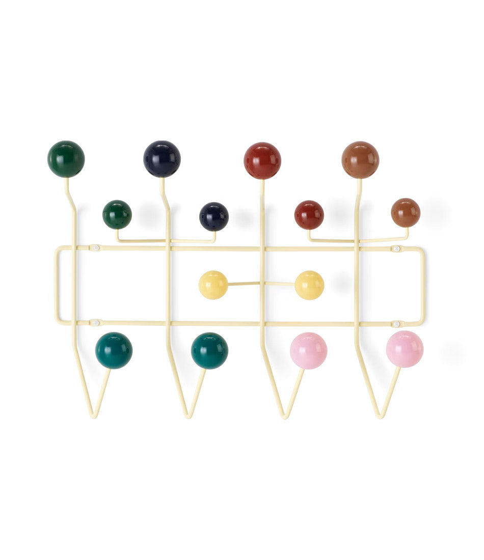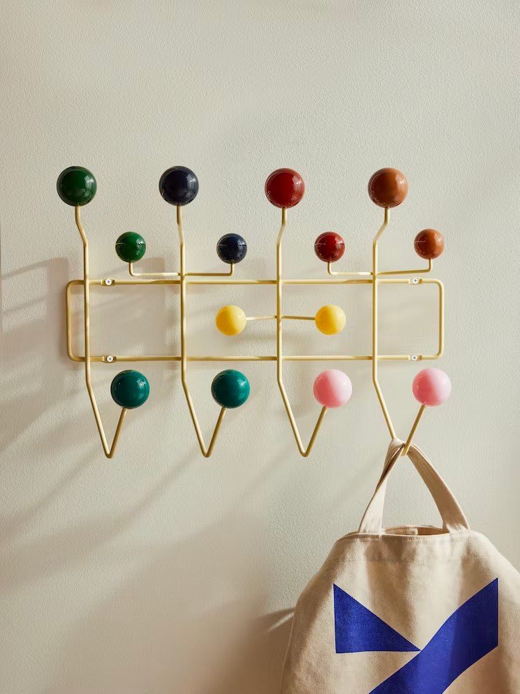 Eames Hang-It-All,最初于1953年发布,体现了Eames夫妇对认真对待乐趣的信念。它采用坚固的钢框架和铸玻璃球制成,这个色彩丰富的衣架使用了与查尔斯和雷为他们的低桌和铁丝椅开发的同时焊接电线相同的技术。